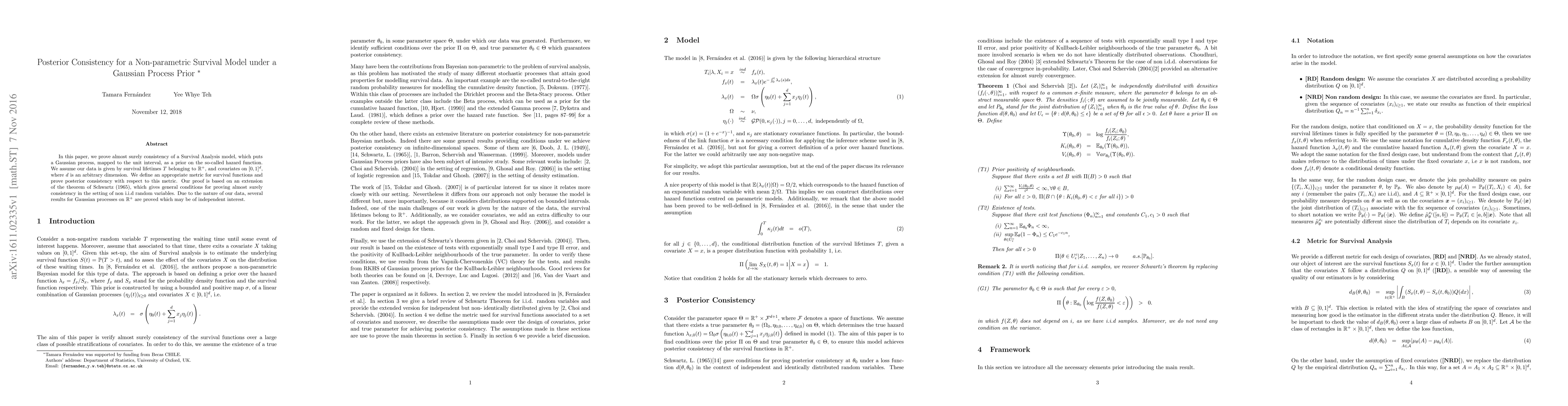This paper proves almost surely consistency for a non-parametric survival model using a Gaussian process prior on the hazard function. The authors establish posterior consistency under a defined metric for survival functions, extending Schwartz's theorem to handle non-i.i.d random variables.