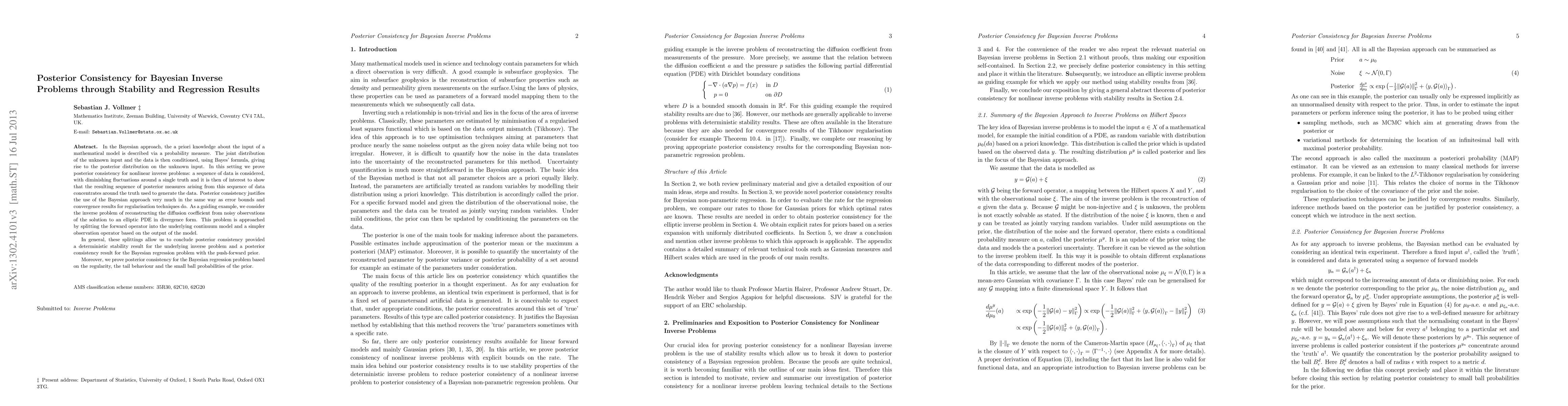 This paper proves posterior consistency for Bayesian inverse problems, demonstrating that the posterior measures converge to the true input as data fluctuations diminish. The authors use a stability result and regression consistency to justify this convergence, illustrated through the example of reconstructing a diffusion coefficient from noisy PDE observations.