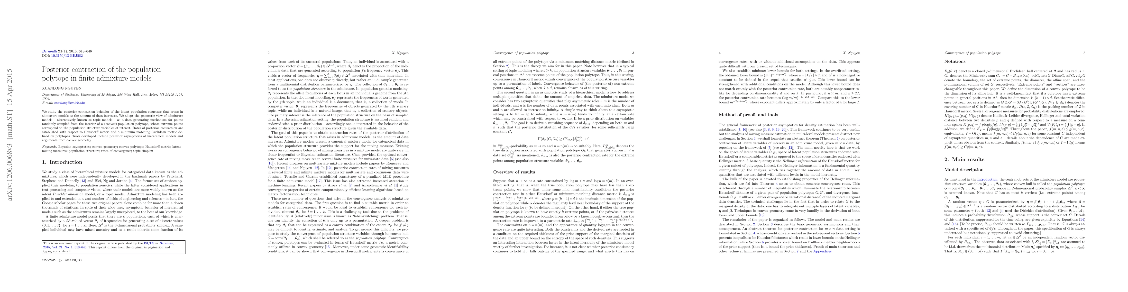 This paper investigates the posterior contraction behavior of admixture models, viewing them as sampling from a population polytope. It establishes rates of posterior contraction using Hausdorff and Euclidean metrics, employing tools from hierarchical models and convex geometry.