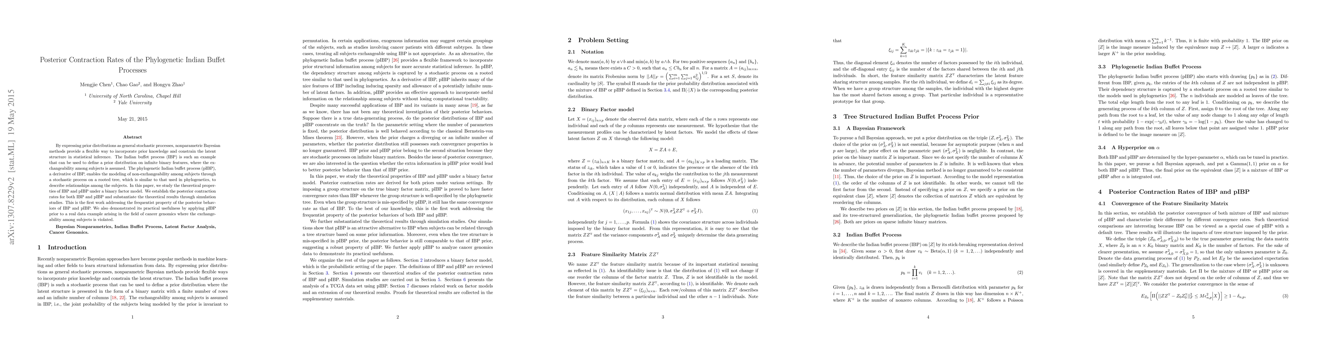 This paper investigates the theoretical properties of the Indian buffet process (IBP) and its phylogenetic variant (pIBP) under a binary factor model, establishing their posterior contraction rates. It also demonstrates practical applications of pIBP in cancer genomics data, highlighting the non-exchangeability among subjects.
