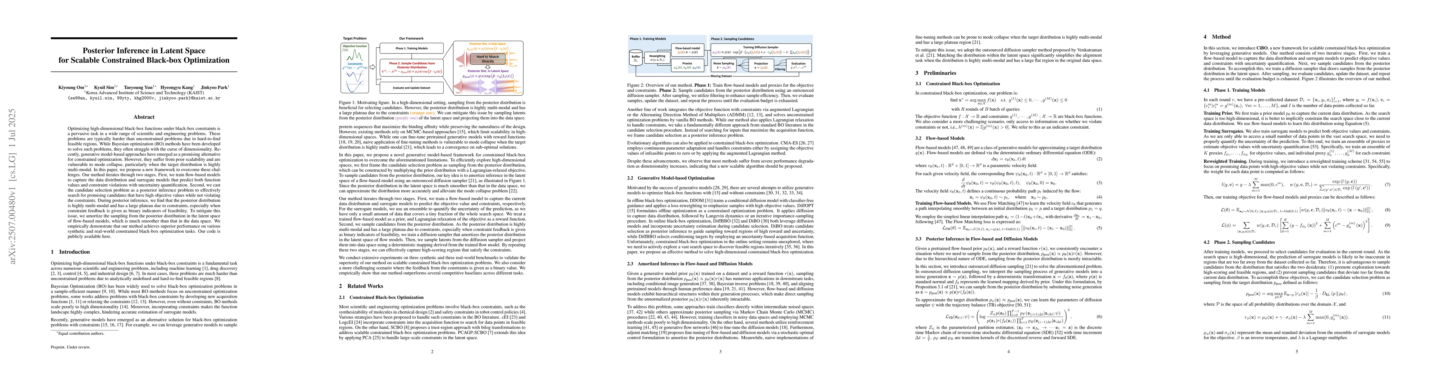 This paper introduces a novel framework for scalable constrained black-box optimization, addressing the challenges of dimensionality and mode collapse in existing generative model-based approaches. The method iteratively trains flow-based models and surrogate models, then uses posterior inference in the latent space to efficiently find candidates with high objective values while respecting constraints. The approach demonstrates superior performance on various optimization tasks.