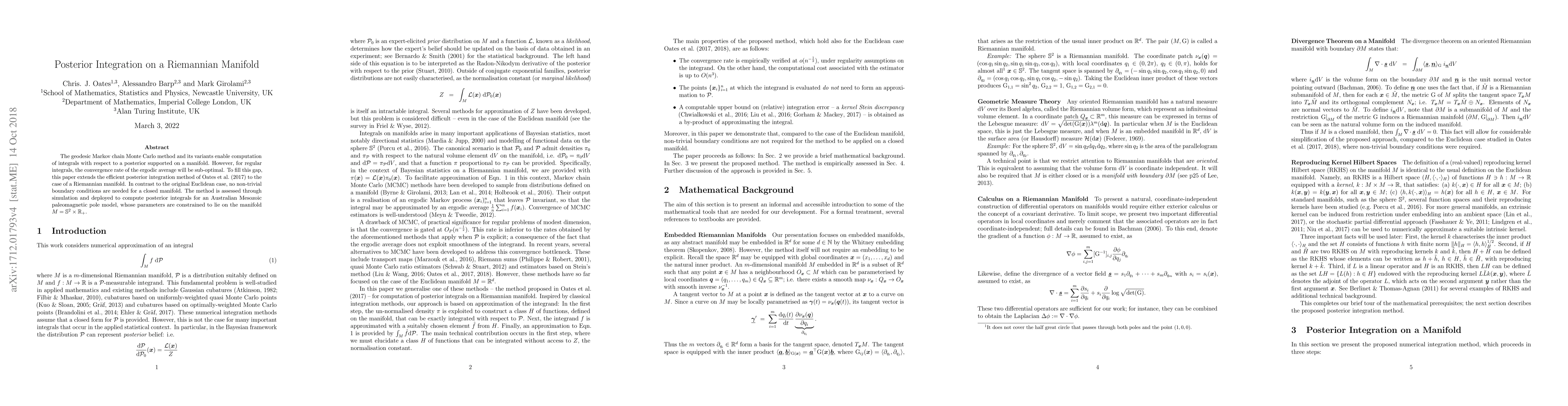 The geodesic Markov chain Monte Carlo method and its variants enable computation of integrals with respect to a posterior supported on a manifold. However, for regular integrals, the convergence rate of the ergodic average will be sub-optimal. To fill this gap, this paper extends the efficient posterior integration method of Oates et al. (2017) to the case of a Riemannian manifold. In contrast to the original Euclidean case, no non-trivial boundary conditions are needed for a closed manifold. The method is assessed through simulation and deployed to compute posterior integrals for an Australian Mesozoic paleomagnetic pole model, whose parameters are constrained to lie on the manifold $M = \mathbb{S}^2 \times \mathbb{R}_+$.