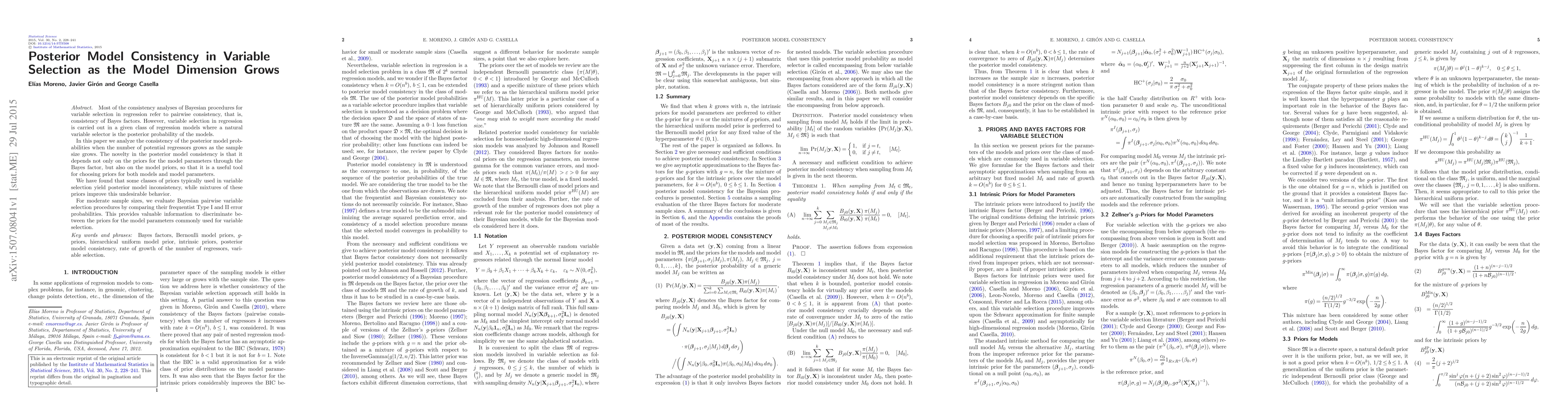 Most of the consistency analyses of Bayesian procedures for variable selection in regression refer to pairwise consistency, that is, consistency of Bayes factors. However, variable selection in regression is carried out in a given class of regression models where a natural variable selector is the posterior probability of the models. In this paper we analyze the consistency of the posterior model probabilities when the number of potential regressors grows as the sample size grows. The novelty in the posterior model consistency is that it depends not only on the priors for the model parameters through the Bayes factor, but also on the model priors, so that it is a useful tool for choosing priors for both models and model parameters. We have found that some classes of priors typically used in variable selection yield posterior model inconsistency, while mixtures of these priors improve this undesirable behavior. For moderate sample sizes, we evaluate Bayesian pairwise variable selection procedures by comparing their frequentist Type I and II error probabilities. This provides valuable information to discriminate between the priors for the model parameters commonly used for variable selection.