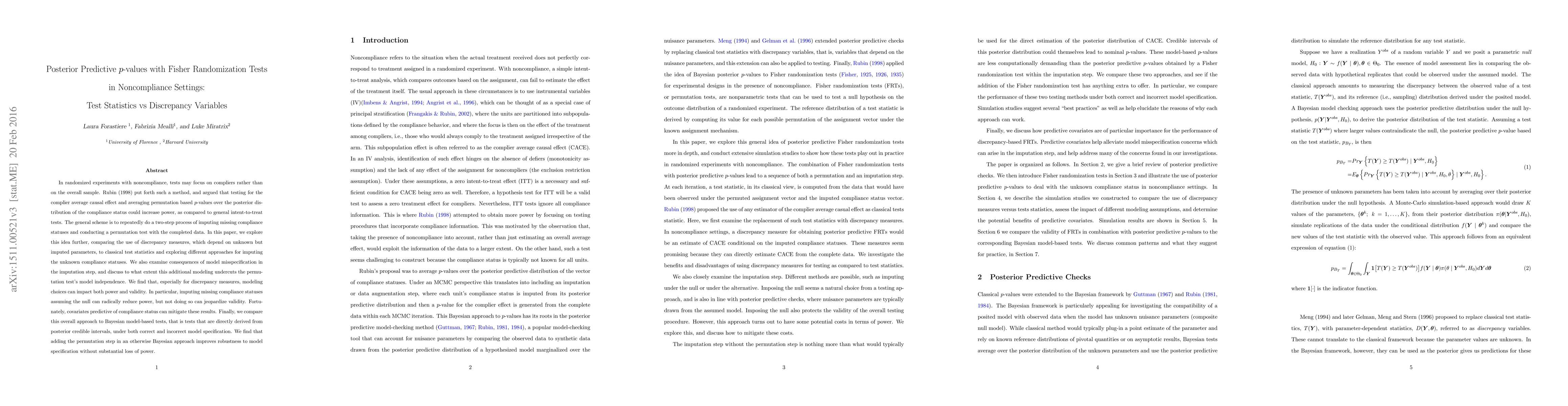 This study explores the use of discrepancy measures versus classical test statistics in Fisher Randomization Tests (FRT-PP) for noncompliance settings, comparing different imputation approaches for unknown compliance statuses and examining the impact of model misspecification.