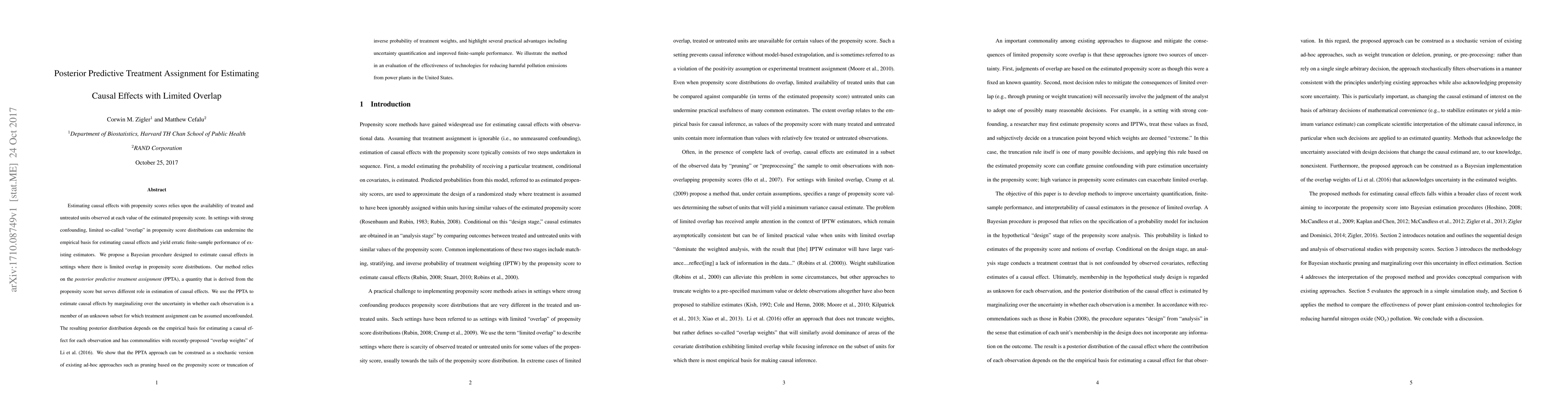 This paper proposes a Bayesian procedure using posterior predictive treatment assignment (PPTA) to estimate causal effects in scenarios with limited overlap in propensity score distributions. The method improves finite-sample performance and uncertainty quantification over existing approaches, demonstrated through an evaluation of pollution reduction technologies in U.S. power plants.