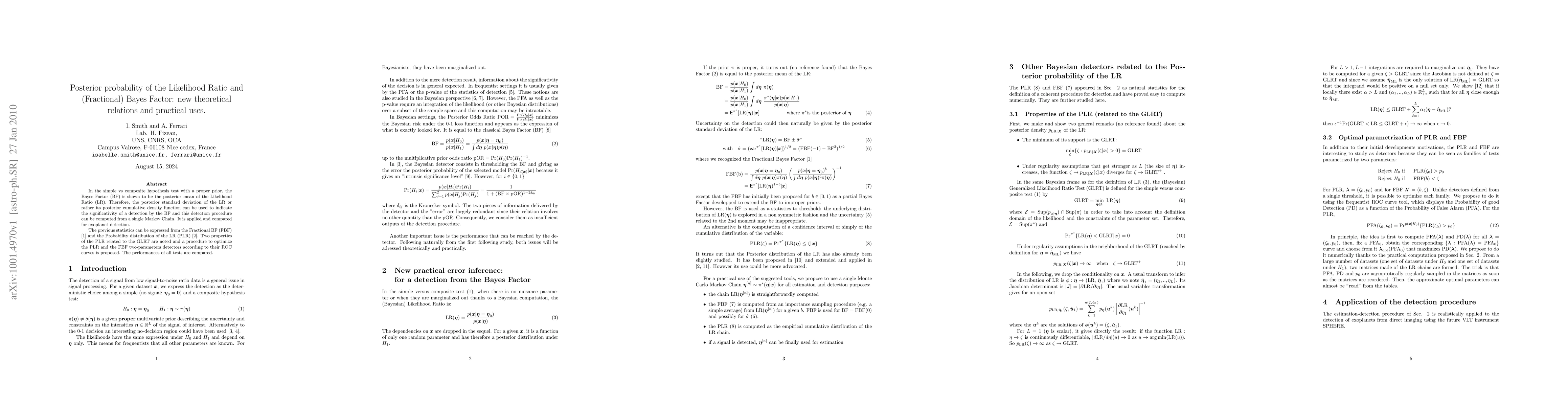 In the simple vs composite hypothesis test with a proper prior, the Bayes Factor (BF) is shown to be the posterior mean of the Likelihood Ratio (LR). Therefore, the posterior standard deviation of the LR or rather its posterior cumulative density function can be used to indicate the significativity of a detection by the BF and this detection procedure can be computed from a single Markov Chain. It is applied and compared for exoplanet detection. The previous statistics can be expressed from the Fractional BF (FBF) \cite{ohagan95} and the Probability distribution of the LR (PLR) \cite{aitkin97}. Two properties of the PLR related to the GLRT are noted and a procedure to optimize the PLR and the FBF two-parameters detectors according to their ROC curves is proposed. The performances of all tests are compared.