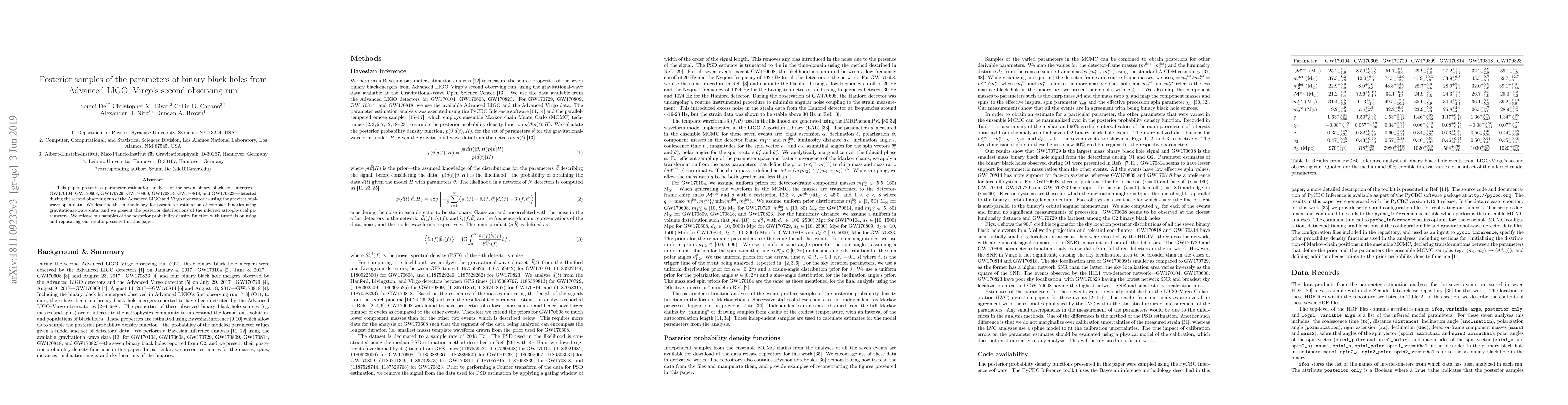 This paper presents a parameter estimation analysis of the seven binary black hole mergers---GW170104, GW170608, GW170729, GW170809, GW170814, GW170818, and GW170823---detected during the second observing run of the Advanced LIGO and Virgo observatories using the gravitational-wave open data. We describe the methodology for parameter estimation of compact binaries using gravitational-wave data, and we present the posterior distributions of the inferred astrophysical parameters. We release our samples of the posterior probability density function with tutorials on using and replicating our results presented in this paper.
