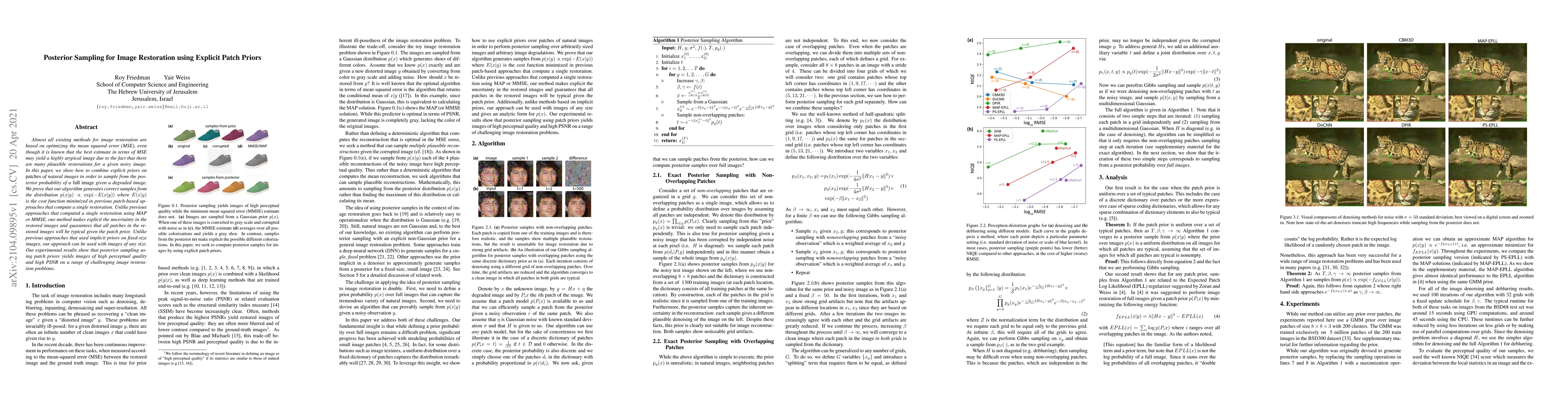 This paper proposes a method for image restoration that samples from the posterior distribution using explicit patch priors, rather than optimizing mean squared error. The approach generates plausible restorations by ensuring all patches conform to typical natural image characteristics, leading to high perceptual quality and PSNR across various restoration tasks.
