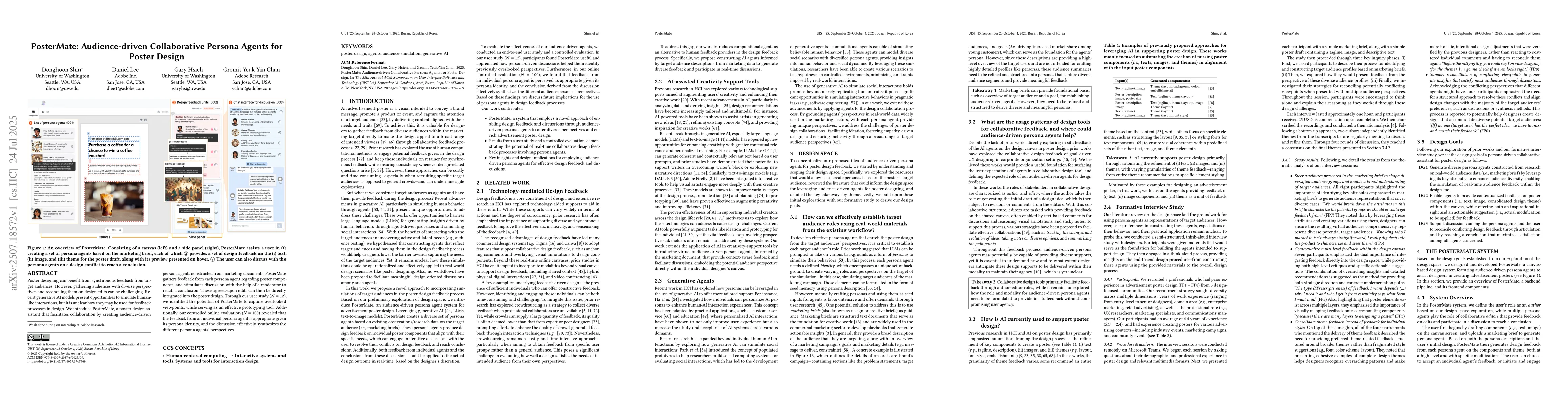 Poster designing can benefit from synchronous feedback from target audiences. However, gathering audiences with diverse perspectives and reconciling them on design edits can be challenging. Recent generative AI models present opportunities to simulate human-like interactions, but it is unclear how they may be used for feedback processes in design. We introduce PosterMate, a poster design assistant that facilitates collaboration by creating audience-driven persona agents constructed from marketing documents. PosterMate gathers feedback from each persona agent regarding poster components, and stimulates discussion with the help of a moderator to reach a conclusion. These agreed-upon edits can then be directly integrated into the poster design. Through our user study (N=12), we identified the potential of PosterMate to capture overlooked viewpoints, while serving as an effective prototyping tool. Additionally, our controlled online evaluation (N=100) revealed that the feedback from an individual persona agent is appropriate given its persona identity, and the discussion effectively synthesizes the different persona agents' perspectives.