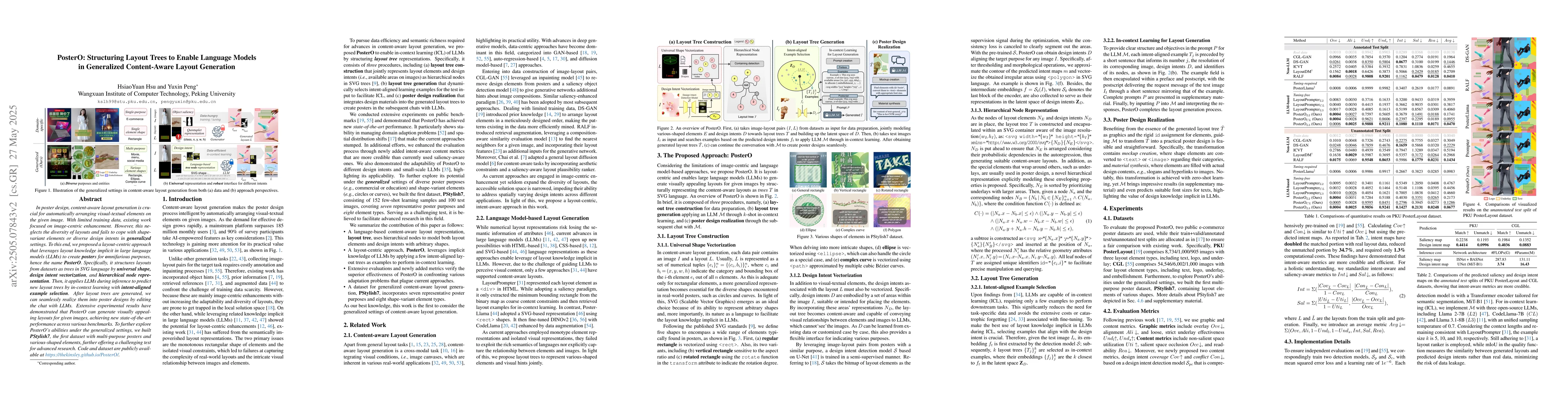 PosterO differentiates itself by focusing on layout knowledge implicit in LLMs and structuring it as trees, which facilitates generalized content-aware layout generation for various design purposes.
