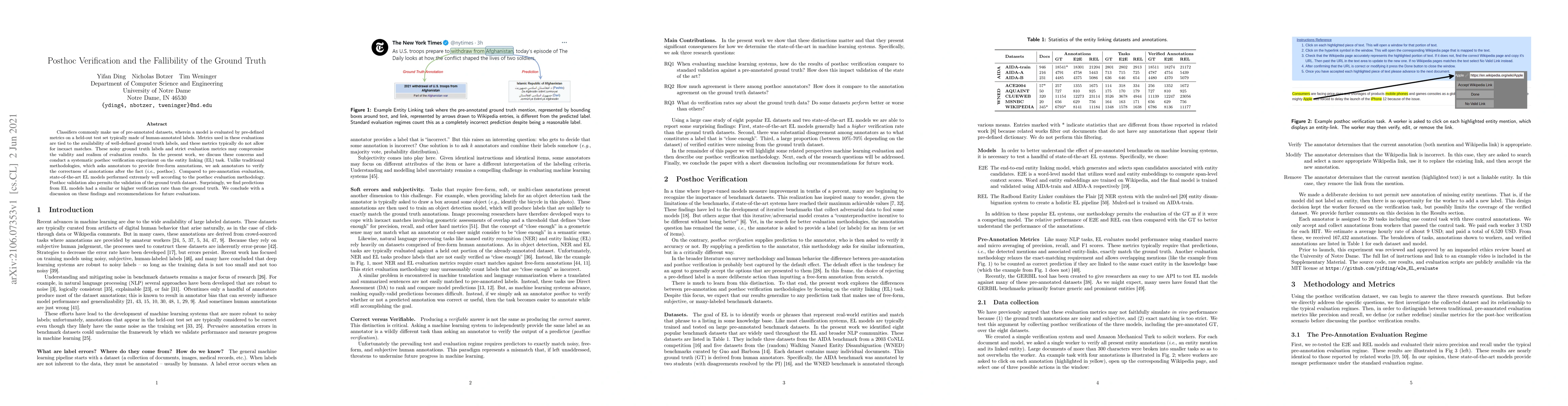 Classifiers commonly make use of pre-annotated datasets, wherein a model is evaluated by pre-defined metrics on a held-out test set typically made of human-annotated labels. Metrics used in these evaluations are tied to the availability of well-defined ground truth labels, and these metrics typically do not allow for inexact matches. These noisy ground truth labels and strict evaluation metrics may compromise the validity and realism of evaluation results. In the present work, we discuss these concerns and conduct a systematic posthoc verification experiment on the entity linking (EL) task. Unlike traditional methodologies, which asks annotators to provide free-form annotations, we ask annotators to verify the correctness of annotations after the fact (i.e., posthoc). Compared to pre-annotation evaluation, state-of-the-art EL models performed extremely well according to the posthoc evaluation methodology. Posthoc validation also permits the validation of the ground truth dataset. Surprisingly, we find predictions from EL models had a similar or higher verification rate than the ground truth. We conclude with a discussion on these findings and recommendations for future evaluations.