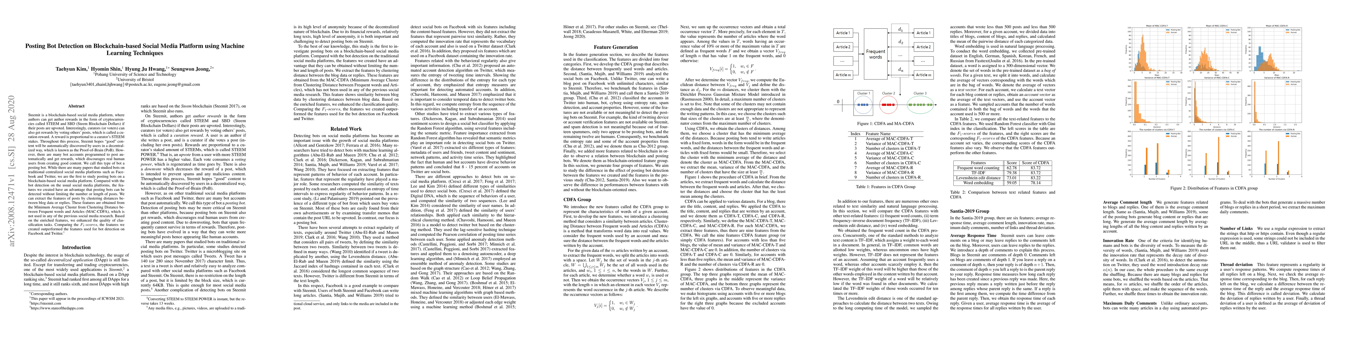 Steemit is a blockchain-based social media platform, where authors can get author rewards in the form of cryptocurrencies called STEEM and SBD (Steem Blockchain Dollars) if their posts are upvoted. Interestingly, curators (or voters) can also get rewards by voting others' posts, which is called a curation reward. A reward is proportional to a curator's STEEM stakes. Throughout this process, Steemit hopes "good" content will be automatically discovered by users in a decentralized way, which is known as the Proof-of-Brain (PoB). However, there are many bot accounts programmed to post automatically and get rewards, which discourages real human users from creating good content. We call this type of bot a posting bot. While there are many papers that studied bots on traditional centralized social media platforms such as Facebook and Twitter, we are the first to study posting bots on a blockchain-based social media platform. Compared with the bot detection on the usual social media platforms, the features we created have an advantage that posting bots can be detected without limiting the number or length of posts. We can extract the features of posts by clustering distances between blog data or replies. These features are obtained from the Minimum Average Cluster from Clustering Distance between Frequent words and Articles (MAC-CDFA), which is not used in any of the previous social media research. Based on the enriched features, we enhanced the quality of classification tasks. Comparing the F1-scores, the features we created outperformed the features used for bot detection on Facebook and Twitter.