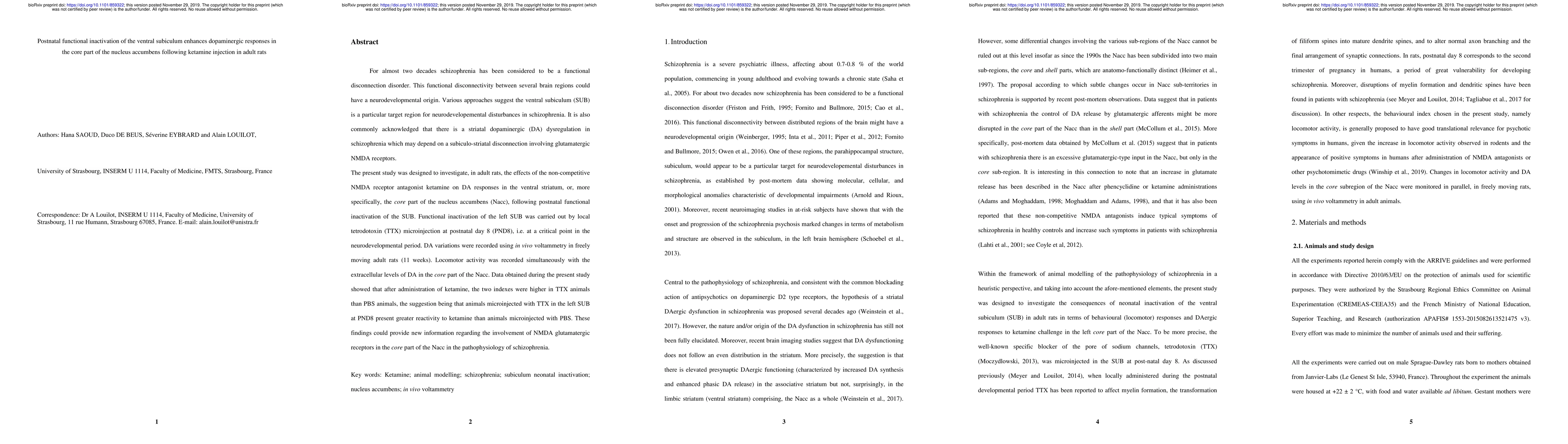 This study investigates the impact of postnatal ventral subiculum inactivation on dopaminergic responses in the nucleus accumbens core following ketamine administration in adult rats. Results indicate that functional inactivation of the ventral subiculum enhances dopaminergic responses to ketamine, suggesting a potential role of NMDA receptors in schizophrenia pathophysiology.