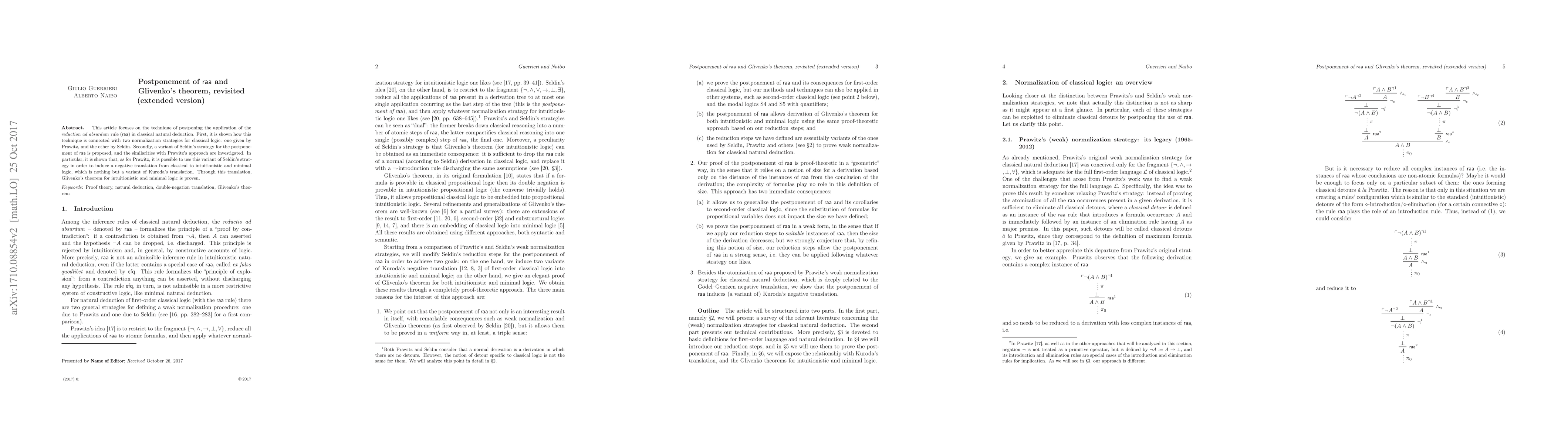 This article focuses on the technique of postponing the application of the reduction ad absurdum rule (raa) in classical natural deduction. First, it is shown how this technique is connected with two normalization strategies for classical logic: one given by Prawitz, and the other by Seldin. Secondly, a variant of Seldin's strategy for the postponement of raa is proposed, and the similarities with Prawitz's approach are investigated. In particular, it is shown that, as for Prawitz, it is possible to use this variant of Seldin's strategy in order to induce a negative translation from classical to intuitionistic and minimal logic, which is nothing but a variant of Kuroda's translation. Through this translation, Glivenko's theorem for intuitionistic and minimal logic is proven.