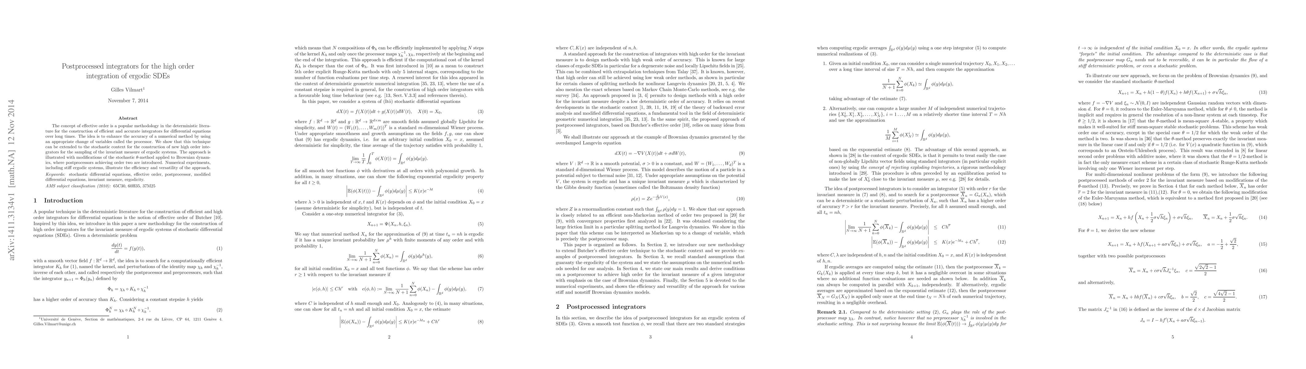 The concept of effective order is a popular methodology in the deterministic literature for the construction of efficient and accurate integrators for differential equations over long times. The idea is to enhance the accuracy of a numerical method by using an appropriate change of variables called the processor. We show that this technique can be extended to the stochastic context for the construction of new high order integrators for the sampling of the invariant measure of ergodic systems. The approach is illustrated with modifications of the stochastic $\theta$-method applied to Brownian dynamics, where postprocessors achieving order two are introduced. Numerical experiments, including stiff ergodic systems, illustrate the efficiency and versatility of the approach.