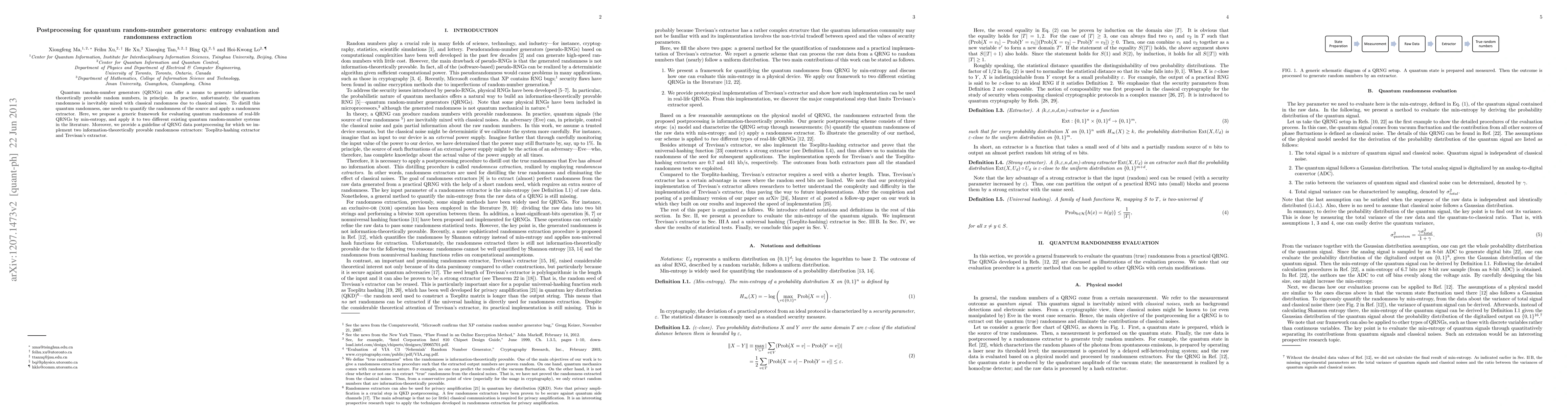 This paper proposes a framework for evaluating the quantum randomness of real-life quantum random number generators (QRNGs) using min-entropy and applies it to two existing systems. It also introduces two information-theoretically provable randomness extractors, Toeplitz-hashing and Trevisan's extractor, for postprocessing QRNG data to distill quantum randomness.