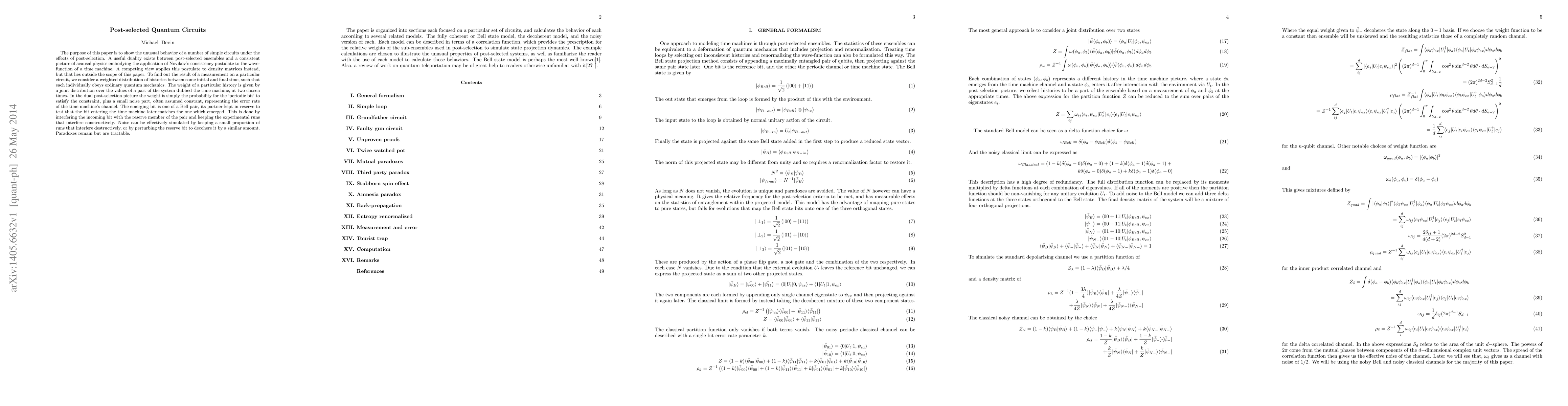 The paper explores post-selected quantum circuits, examining their behavior through a duality with acausal physics and Novikov's consistency postulate.