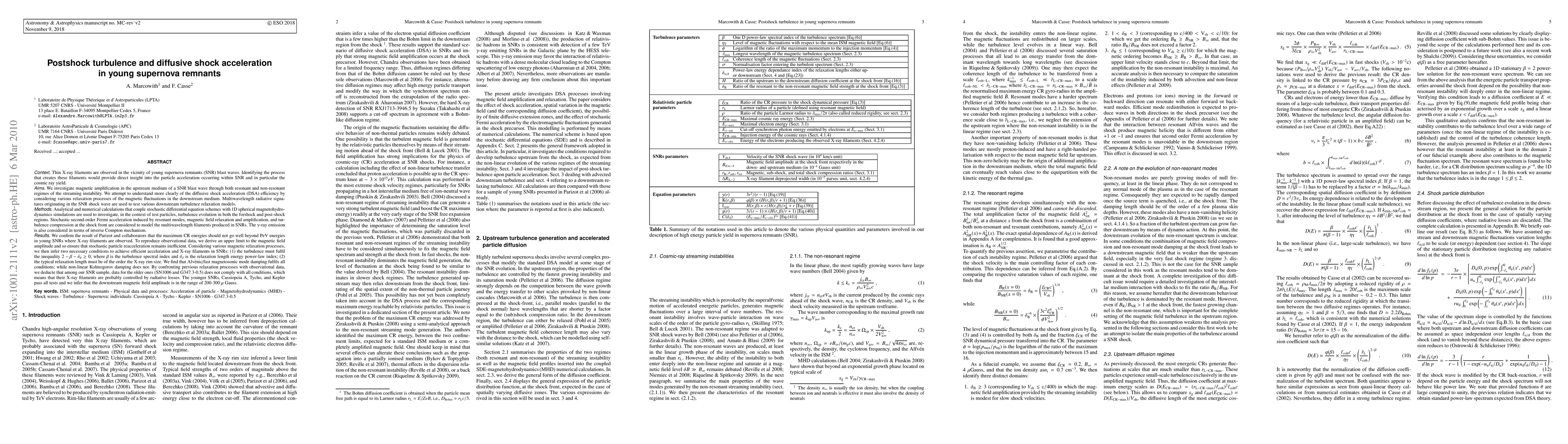 This paper explores magnetic amplification in young supernova remnants (SNRs) and the efficiency of diffusive shock acceleration (DSA), confirming that maximum cosmic ray energies do not exceed PeV. It identifies conditions for efficient acceleration and X-ray filaments, finding that Alv\'enic/fast magnetosonic modes meet these conditions while non-linear Kolmogorov damping does not.