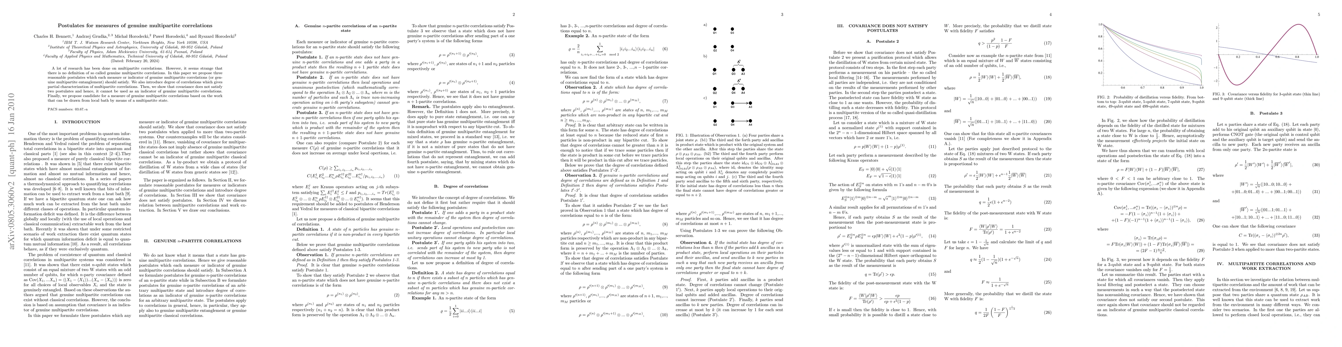 This paper proposes three postulates that any measure of genuine multipartite correlations should satisfy and introduces a degree of correlation for partial characterization. It argues that covariance fails to meet these criteria and suggests a new candidate measure based on local bath work.