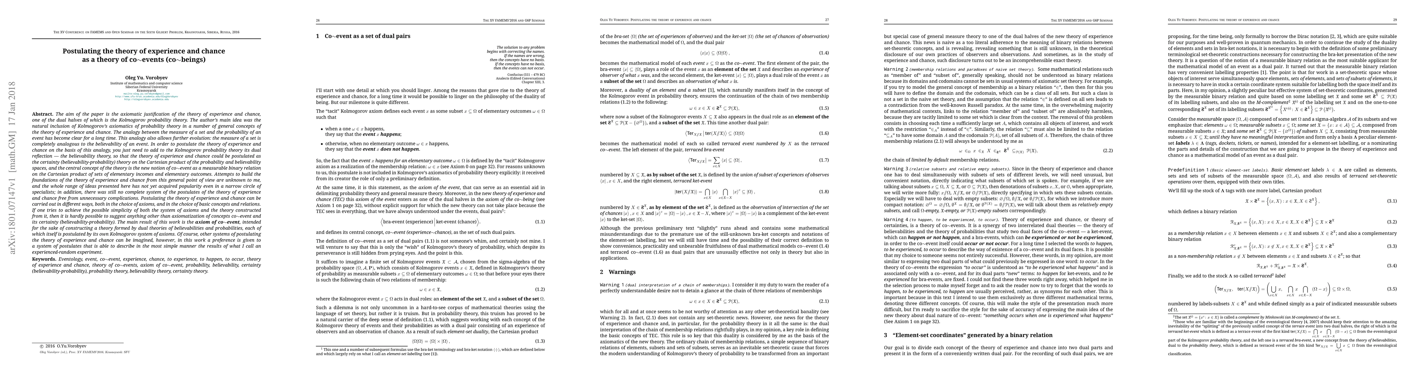 The paper aim is the axiomatic justification of the theory of experience and chance, one of the dual halves of which is the Kolmogorov probability theory. The author's main idea was the natural inclusion of Kolmogorov's axiomatics of probability theory in a number of general concepts of the theory of experience and chance. The analogy between the measure of a set and the probability of an event has become clear for a long time. This analogy also allows further evolution: the measure of a set is completely analogous to the believability of an event. In order to postulate the theory of experience and chance on the basis of this analogy, you just need to add to the Kolmogorov probability theory its dual reflection - the believability theory, so that the theory of experience and chance could be postulated as the certainty (believability-probability) theory on the Cartesian product of the probability and believability spaces, and the central concept of the theory is the new notion of co~event as a measurable binary relation on the Cartesian product of sets of elementary incomes and elementary outcomes. Attempts to build the foundations of the theory of experience and chance from this general point of view are unknown to me, and the whole range of ideas presented here has not yet acquired popularity even in a narrow circle of specialists; in addition, there was still no complete system of the postulates of the theory of experience and chance free from unnecessary complications. The main result of this work is the axiom of co~event, intended for the sake of constructing a theory formed by dual theories of believabilities and probabilities, each of which itself is postulated by its own Kolmogorov system of axioms. Here a preference is given to a system of postulates that is able to describe in a simple manner the results of what I call an experienced-random experiment.
