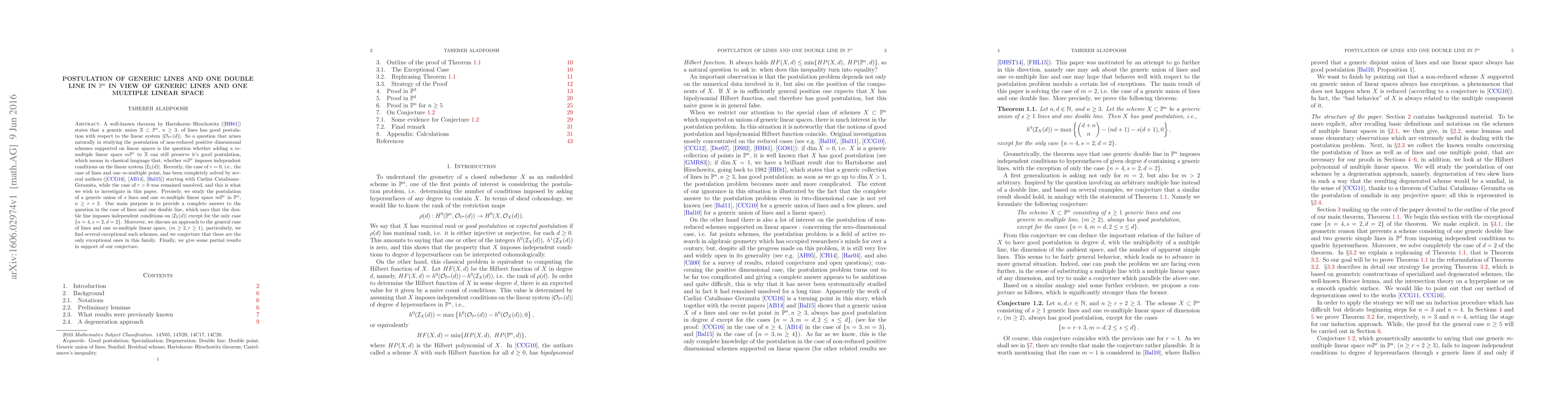 Researchers investigate how adding a multiple linear space to a generic union of lines affects its postulation in projective space, finding that a double line imposes independent conditions on the linear system except for specific cases.