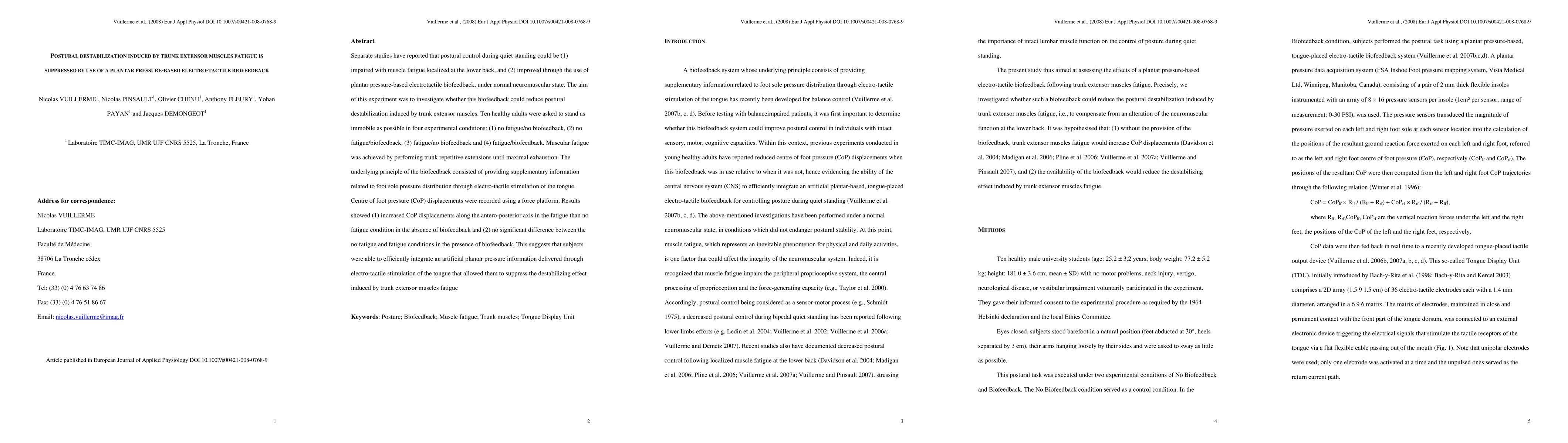 This study found that electro-tactile biofeedback based on plantar pressure information can suppress postural destabilization caused by trunk extensor muscle fatigue. Participants showed increased postural instability when fatigued without biofeedback, but stability was maintained when biofeedback was provided.