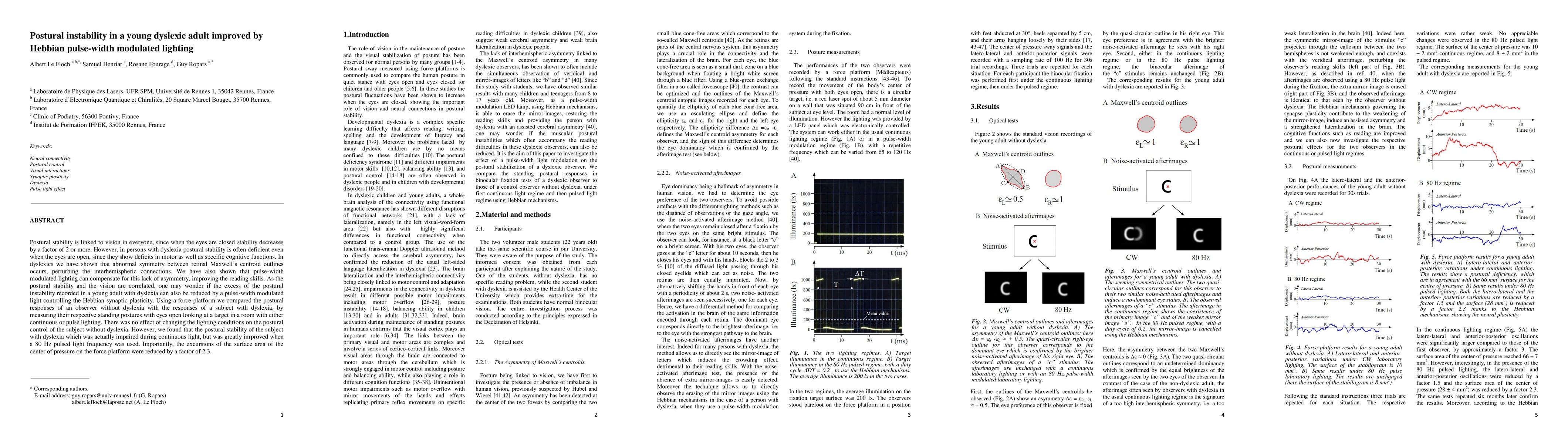Postural stability is linked to vision in everyone, since when the eyes are closed stability decreases by a factor of 2 or more. However, in persons with dyslexia postural stability is often deficient even when the eyes are open, since they show deficits in motor as well as specific cognitive functions. In dyslexics we have shown that abnormal symmetry between retinal Maxwell's centroid outlines occurs, perturbing the interhemispheric connections. We have also shown that pulse-width modulated lighting can compensate for this lack of asymmetry, improving the reading skills. As the postural stability and the vision are correlated, one may wonder if the excess of the postural instability recorded in a young adult with dyslexia can also be reduced by a pulse-width modulated light controlling the Hebbian synaptic plasticity. Using a force platform we compared the postural responses of an observer without dyslexia with the responses of a subject with dyslexia, by measuring their respective standing postures with eyes open looking at a target in a room with either continuous or pulse lighting. There was no effect of changing the lighting conditions on the postural control of the subject without dyslexia. However, we found that the postural stability of the subject with dyslexia which was actually impaired during continuous light, but was greatly improved when a 80 Hz pulsed light frequency was used. Importantly, the excursions of the surface area of the center of pressure on the force platform were reduced by a factor of 2.3.