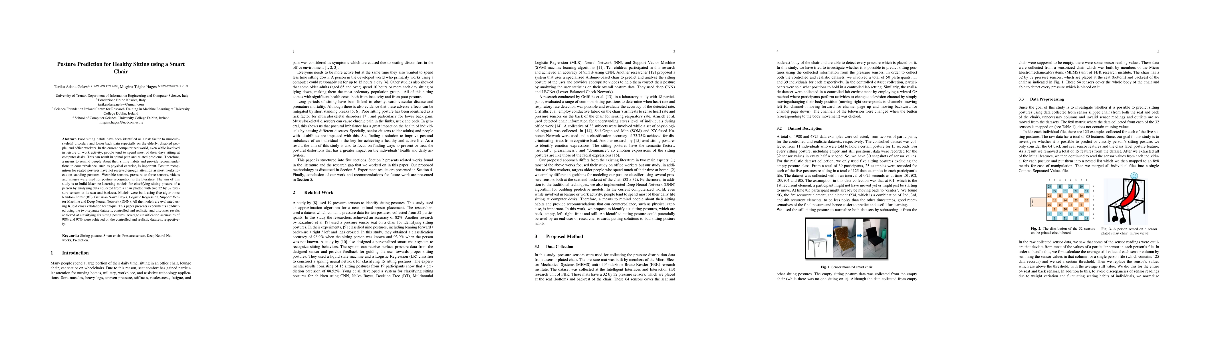 This paper develops machine learning models to classify sitting postures using data from a smart chair equipped with pressure sensors, aiming to improve sitting habits and prevent musculoskeletal disorders. The study evaluates five algorithms and achieves high classification accuracies of 98% and 97% on controlled and realistic datasets, respectively.