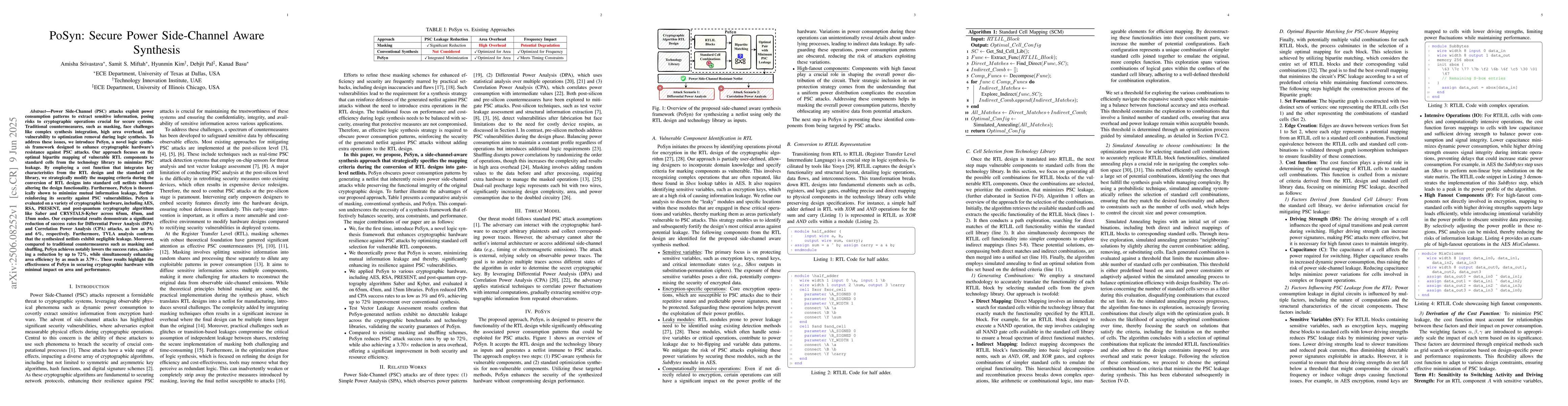PoSyn is a new synthesis method that reduces power side-channel vulnerabilities in cryptographic hardware by optimizing how components are mapped to standard cells, significantly lowering attack success rates while improving area efficiency. This approach enhances hardware security without altering functionality and outperforms traditional countermeasures like masking.