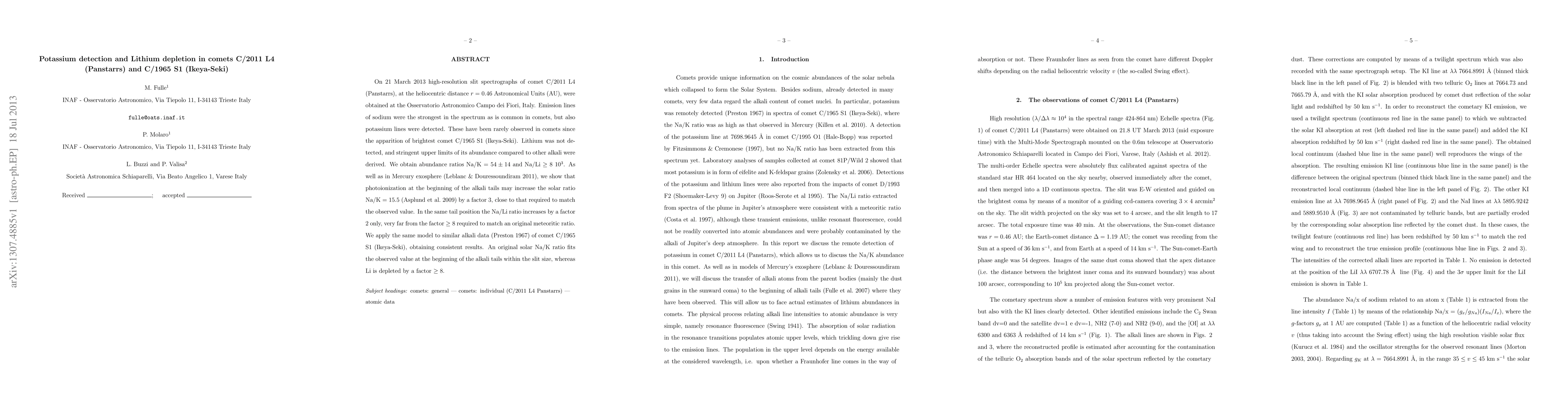 This research detected potassium lines in comet C/2011 L4 (Panstarrs) and found no lithium, deriving abundance ratios Na/K = 54 +/-14 and Na/Li > 8000. It suggests photoionization increases the solar Na/K ratio by a factor 3, but cannot match the original meteoritic Na/Li ratio due to lithium depletion.
