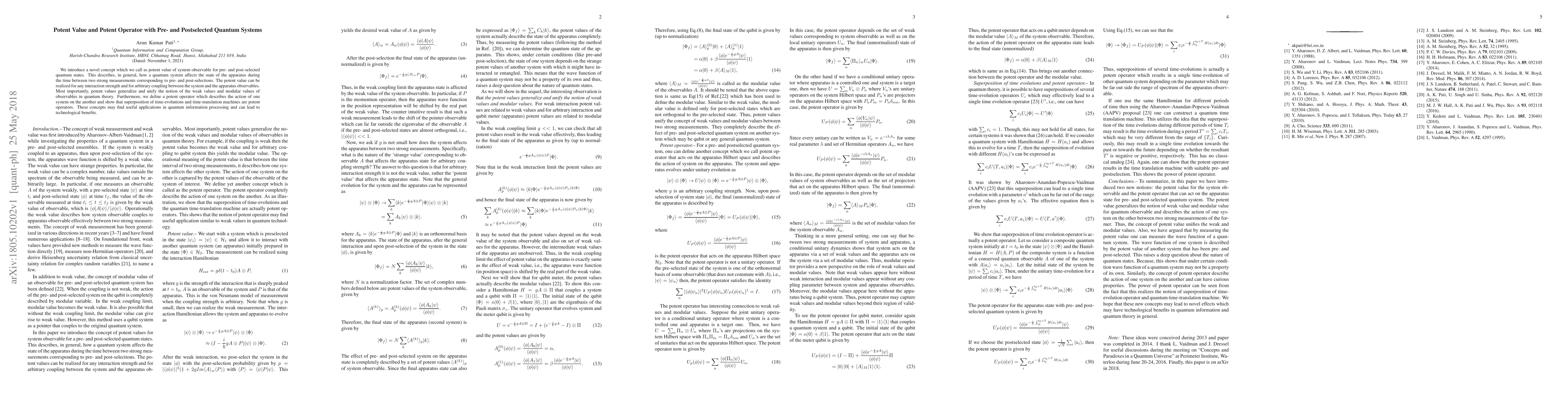 We introduce a novel concept which we call as potent value of system observable for pre- and post-selected quantum states. This describes, in general, how a quantum system affects the state of the apparatus during the time between two strong measurements corresponding to pre- and post-selections. The potent value can be realized for any interaction strength and for arbitrary coupling between the system and the apparatus observables. Most importantly, potent values generalize and unify the notion of the weak values and modular values of observables in quantum theory. Furthermore, we define a potent operator which describes the action of one system on the another and show that superposition of time-evolutions and time-translation machines are potent operators. These concepts may find useful applications in quantum information processing and can lead to technological benefits.