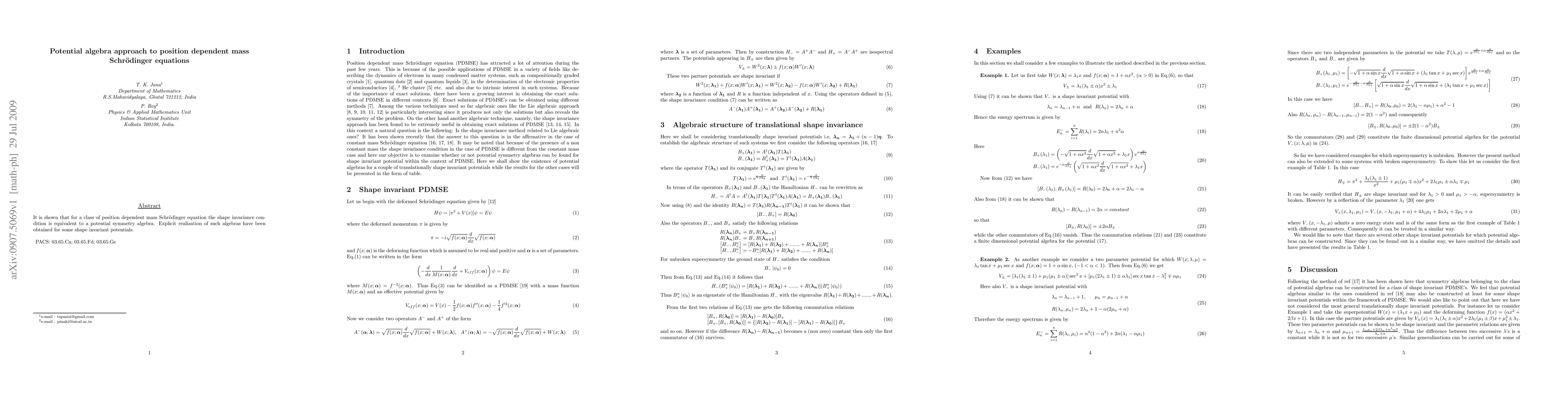 Summary: This paper demonstrates that the shape invariance condition for a class of position dependent mass Schrödinger equations corresponds to a potential symmetry algebra. It also provides explicit realizations of these algebras for certain shape invariant potentials.