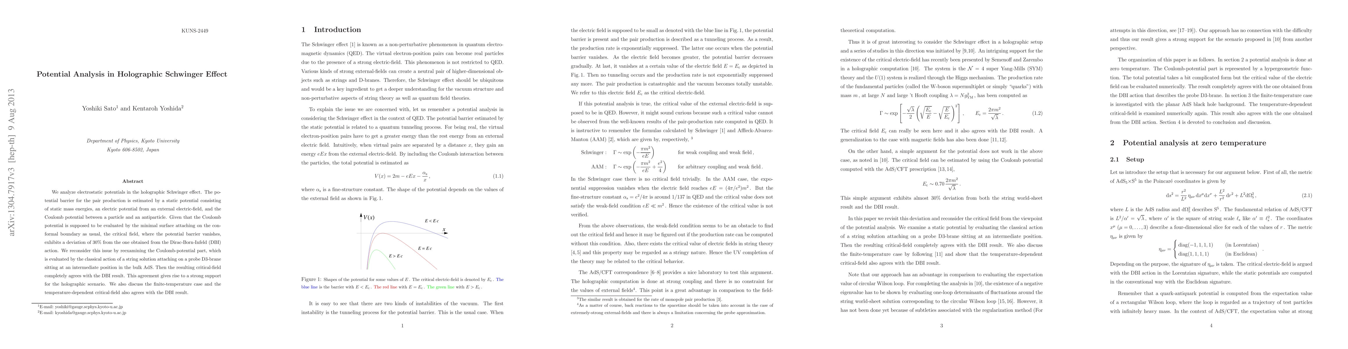 Researchers analyzed electrostatic potentials in the holographic Schwinger effect, finding that critical fields deviate 30% from Dirac-Born-Infeld results until reevaluating the Coulomb potential part, which agreed with DBI results.