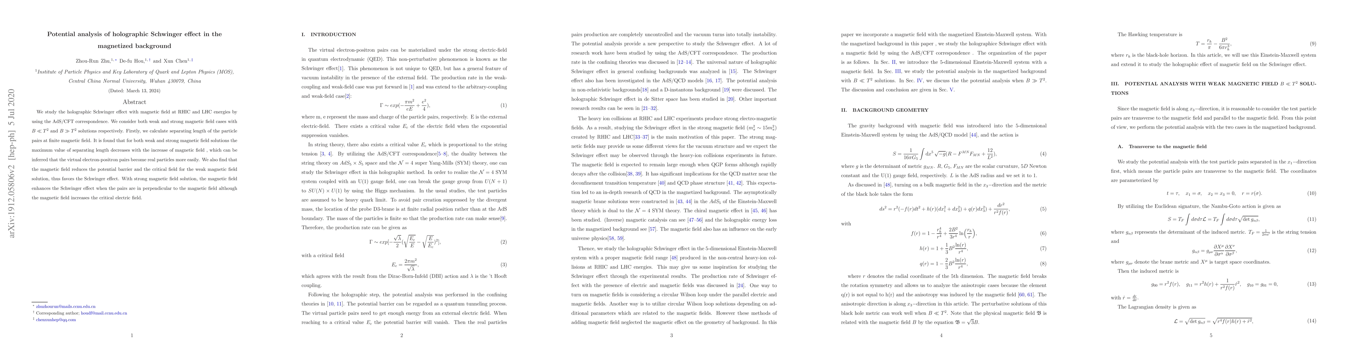 We study the holographic Schwinger effect with magnetic field at RHIC and LHC energies by using the AdS/CFT correspondence. We consider both weak and strong magnetic field cases with $B\ll T^2$ and $B\gg T^2$ solutions respectively. Firstly, we calculate separating length of the particle pairs at finite magnetic field. It is found that for both weak and strong magnetic field solutions the maximum value of separating length decreases with the increase of magnetic field , which can be inferred that the virtual electron-positron pairs become real particles more easily. We also find that the magnetic field reduces the potential barrier and the critical field for the weak magnetic field solution, thus favors the Schwinger effect. With strong magnetic field solution, the magnetic field enhances the Schwinger effect when the pairs are in perpendicular to the magnetic field although the magnetic field increases the critical electric field.