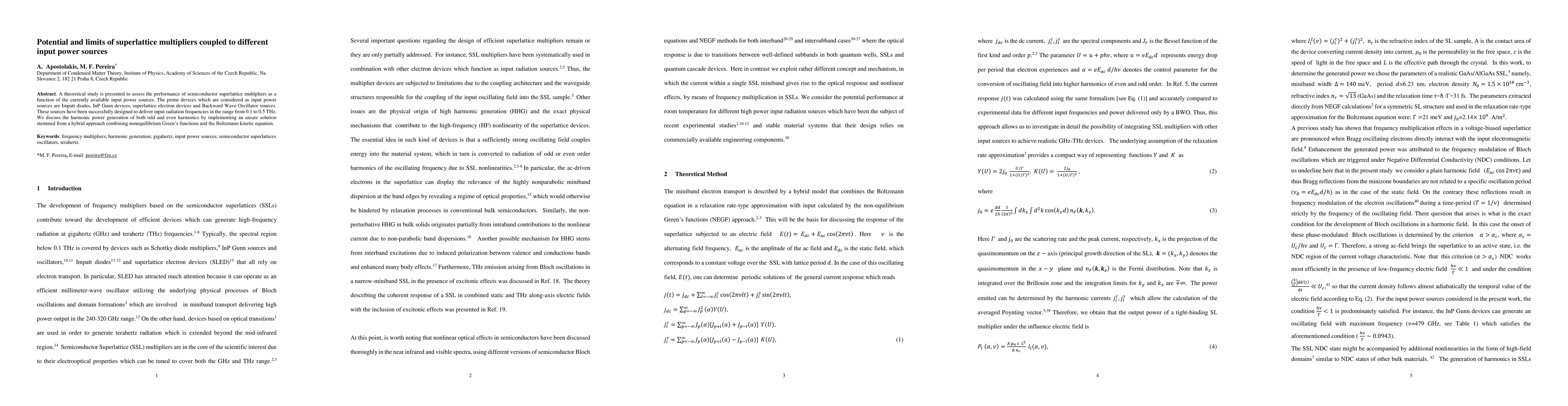 A theoretical study is presented to assess the performance of semiconductor superlattice multipliers as a function of the currently available input power sources. The prime devices which are considered as input power sources are Impatt diodes, InP Gunn devices, superlattice electron devices and Backward Wave Oscillator sources. These sources have been successfully designed to deliver input radiation frequencies in the range from 0.1 to 0.5 THz. We discuss the harmonic power generation of both odd and even harmonics by implementing an ansatz solution stemmed from a hybrid approach combining nonequilibrium Green's functions and the Boltzmann kinetic equation.