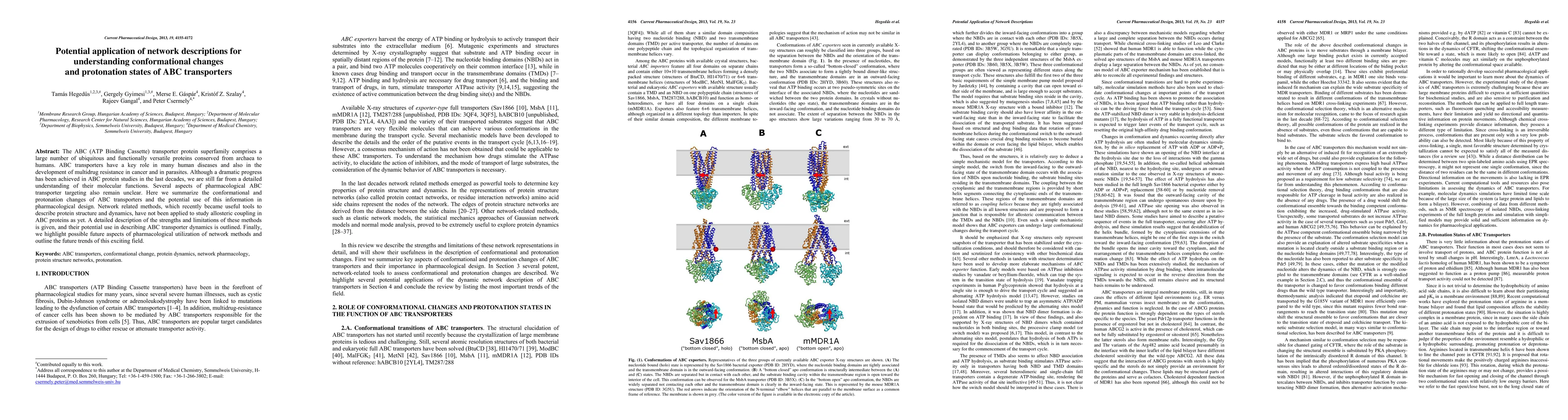 The ABC (ATP Binding Cassette) transporter protein superfamily comprises a large number of ubiquitous and functionally versatile proteins conserved from archaea to humans. ABC transporters have a key role in many human diseases and also in the development of multidrug resistance in cancer and in parasites. Although a dramatic progress has been achieved in ABC protein studies in the last decades, we are still far from a detailed understanding of their molecular functions. Several aspects of pharmacological ABC transporter targeting also remain unclear. Here we summarize the conformational and protonation changes of ABC transporters and the potential use of this information in pharmacological design. Network related methods, which recently became useful tools to describe protein structure and dynamics, have not been applied to study allosteric coupling in ABC proteins as yet. A detailed description of the strengths and limitations of these methods is given, and their potential use in describing ABC transporter dynamics is outlined. Finally, we highlight possible future aspects of pharmacological utilization of network methods and outline the future trends of this exciting field.