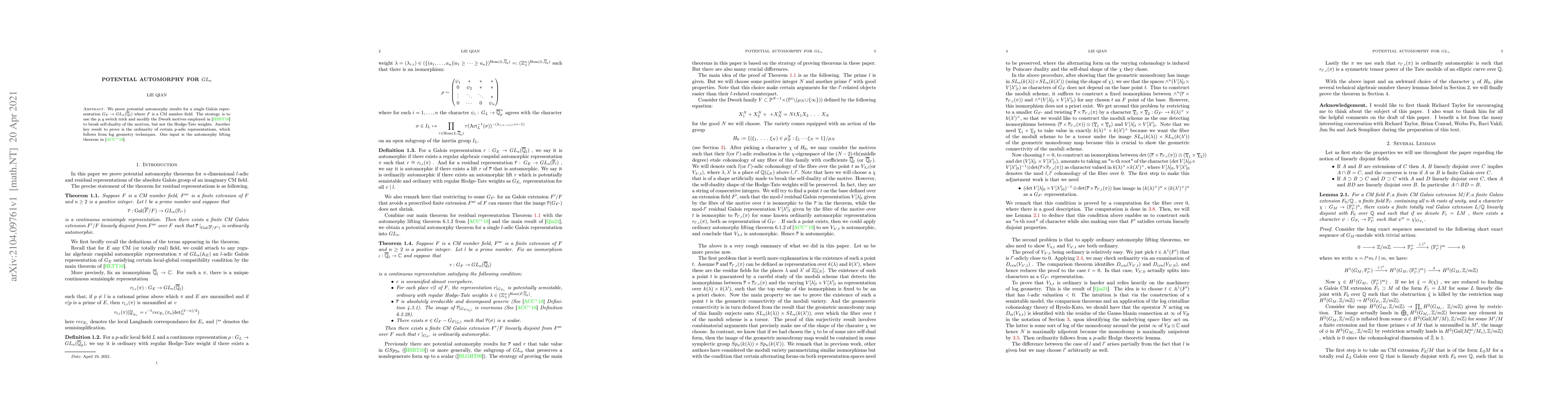 This paper proves potential automorphy for a Galois representation into $GL_n(\overline{\mathbb{Q}}_l)$ over a CM number field using the $p,q$ switch trick and modified Dwork motives. It also leverages log geometry techniques to establish the ordinarity of certain $p$-adic representations.