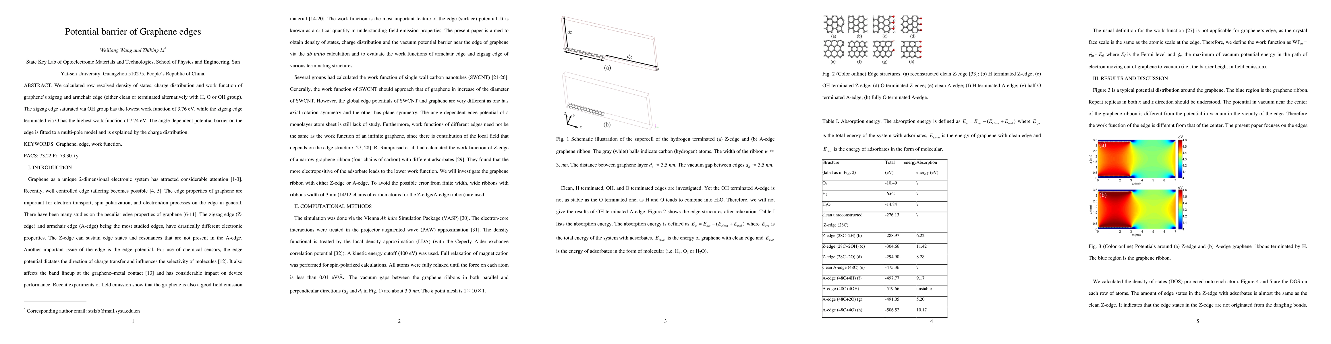 We calculated row resolved density of states, charge distribution and work function of graphene's zigzag and armchair edge (either clean or terminated alternatively with H, O or OH group). The zigzag edge saturated via OH group has the lowest work function of 3.76 eV, while the zigzag edge terminated via O has the highest work function of 7.74 eV. The angle-dependent potential barrier on the edge is fitted to a multi-pole model and is explained by the charge distribution.