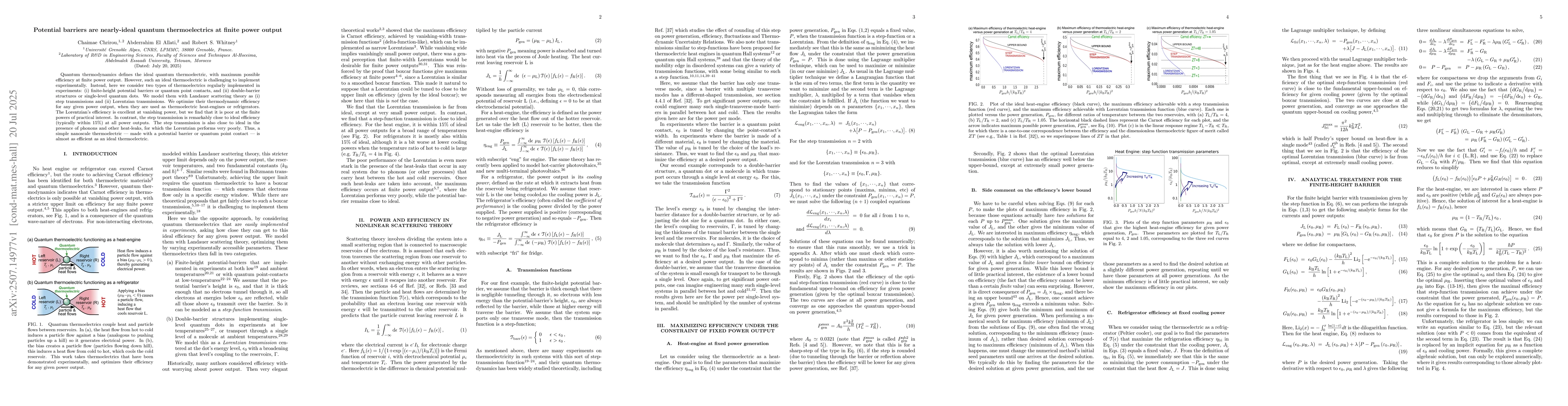 The research models thermoelectric efficiency of finite-height potential barriers and double-barrier structures using Landauer scattering theory, optimizing for given power output as heat engines or refrigerators.