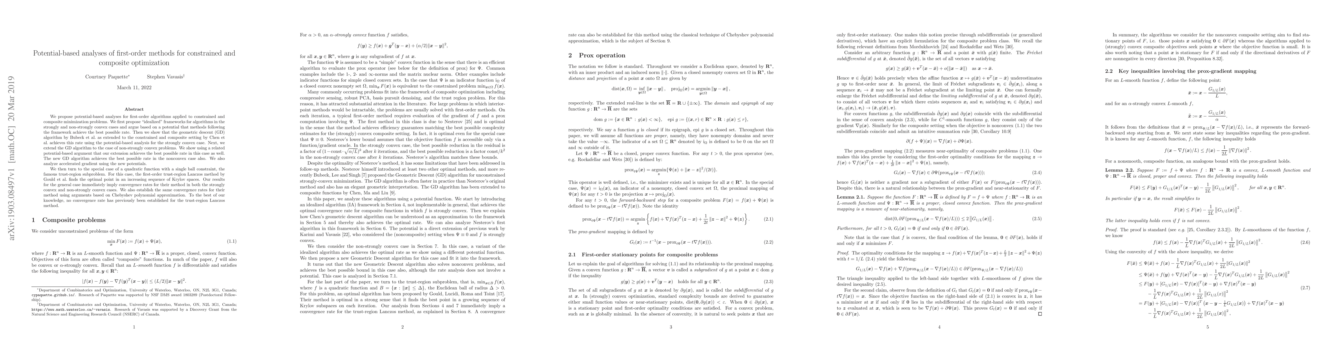 We propose potential-based analyses for first-order algorithms applied to constrained and composite minimization problems. We first propose ``idealized'' frameworks for algorithms in the strongly and non-strongly convex cases and argue based on a potential that methods following the framework achieve the best possible rate. Then we show that the geometric descent (GD) algorithm by Bubeck et al.\ as extended to the constrained and composite setting by Chen et al.\ achieves this rate using the potential-based analysis for the strongly convex case. Next, we extend the GD algorithm to the case of non-strongly convex problems. We show using a related potential-based argument that our extension achieves the best possible rate in this case as well. The new GD algorithm achieves the best possible rate in the nonconvex case also. We also analyze accelerated gradient using the new potentials. We then turn to the special case of a quadratic function with a single ball constraint, the famous trust-region subproblem. For this case, the first-order trust-region Lanczos method by Gould et al.\ finds the optimal point in an increasing sequence of Krylov spaces. Our results for the general case immediately imply convergence rates for their method in both the strongly convex and non-strongly convex cases. We also establish the same convergence rates for their method using arguments based on Chebyshev polynomial approximation. To the best of our knowledge, no convergence rate has previously been established for the trust-region Lanczos method.