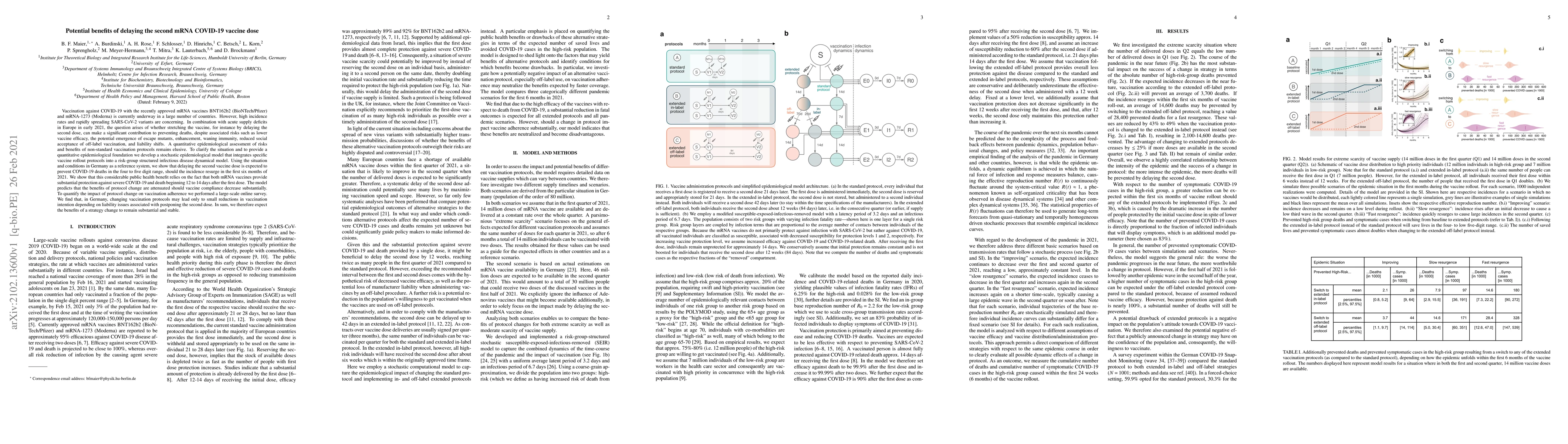 Vaccination against COVID-19 with the recently approved mRNA vaccines BNT162b2 (BioNTech/Pfizer) and mRNA-1273 (Moderna) is currently underway in a large number of countries. However, high incidence rates and rapidly spreading SARS-CoV-2 variants are concerning. In combination with acute supply deficits in Europe in early 2021, the question arises of whether stretching the vaccine, for instance by delaying the second dose, can make a significant contribution to preventing deaths, despite associated risks such as lower vaccine efficacy, the potential emergence of escape mutants, enhancement, waning immunity, reduced social acceptance of off-label vaccination, and liability shifts. A quantitative epidemiological assessment of risks and benefits of non-standard vaccination protocols remains elusive. To clarify the situation and to provide a quantitative epidemiological foundation we develop a stochastic epidemiological model that integrates specific vaccine rollout protocols into a risk-group structured infectious disease dynamical model. Using the situation and conditions in Germany as a reference system, we show that delaying the second vaccine dose is expected to prevent deaths in the four to five digit range, should the incidence resurge. We show that this considerable public health benefit relies on the fact that both mRNA vaccines provide substantial protection against severe COVID-19 and death beginning 12 to 14 days after the first dose. The benefits of protocol change are attenuated should vaccine compliance decrease substantially. To quantify the impact of protocol change on vaccination adherence we performed a large-scale online survey. We find that, in Germany, changing vaccination protocols may lead to small reductions in vaccination intention. In sum, we therefore expect the benefits of a strategy change to remain substantial and stable.