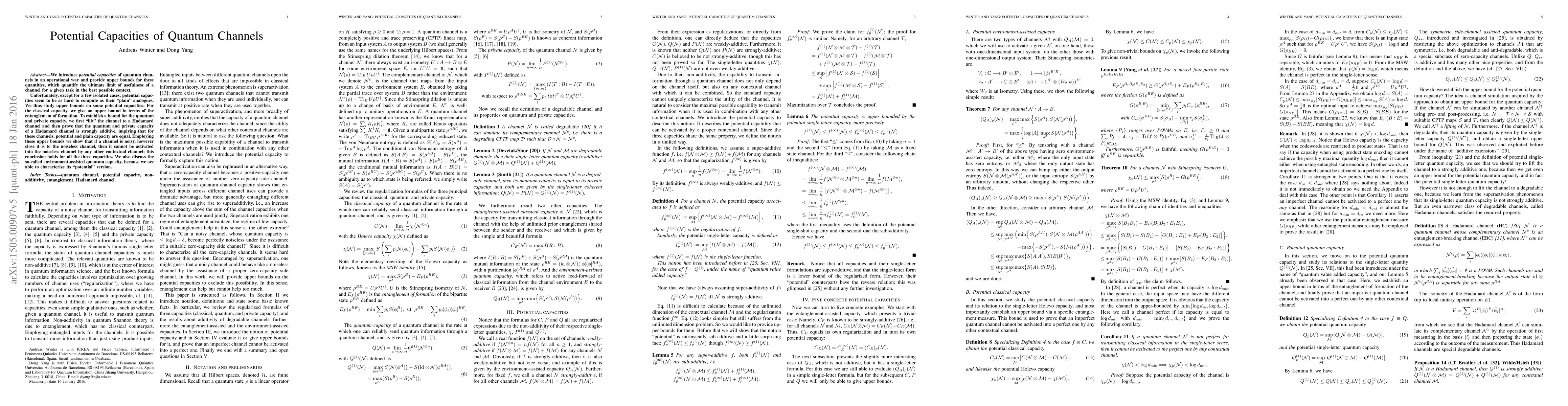 This paper introduces potential capacities of quantum channels and provides upper bounds for these quantities, which represent the ultimate limit of a channel's usefulness. It finds that, except for a few cases, computing potential capacities is as difficult as computing classical capacities, and it establishes bounds for classical, quantum, and private capacities using entanglement and Hadamard channels.