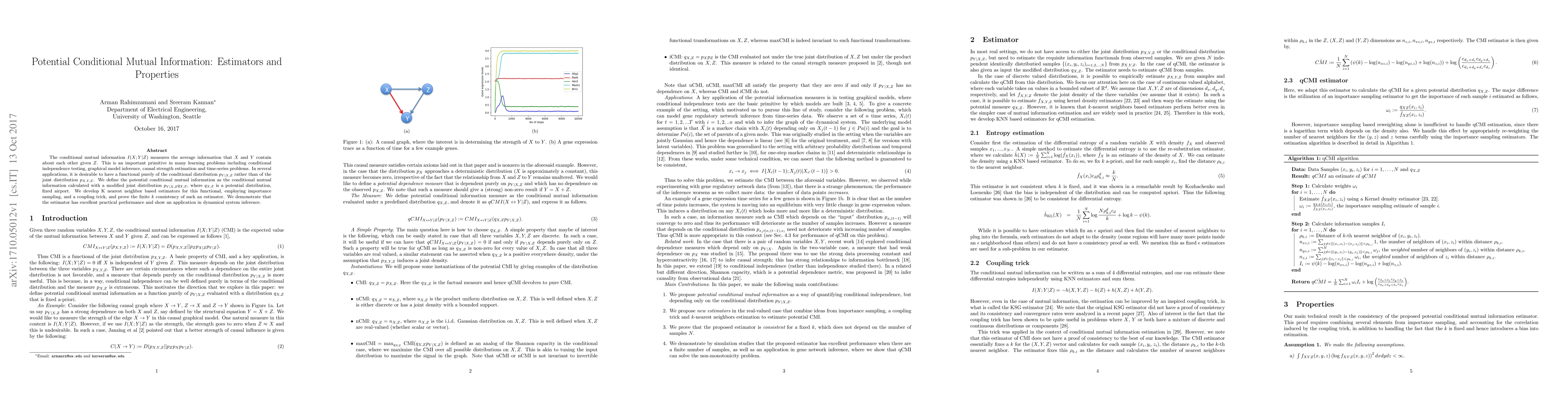 The conditional mutual information I(X;Y|Z) measures the average information that X and Y contain about each other given Z. This is an important primitive in many learning problems including conditional independence testing, graphical model inference, causal strength estimation and time-series problems. In several applications, it is desirable to have a functional purely of the conditional distribution p_{Y|X,Z} rather than of the joint distribution p_{X,Y,Z}. We define the potential conditional mutual information as the conditional mutual information calculated with a modified joint distribution p_{Y|X,Z} q_{X,Z}, where q_{X,Z} is a potential distribution, fixed airport. We develop K nearest neighbor based estimators for this functional, employing importance sampling, and a coupling trick, and prove the finite k consistency of such an estimator. We demonstrate that the estimator has excellent practical performance and show an application in dynamical system inference.