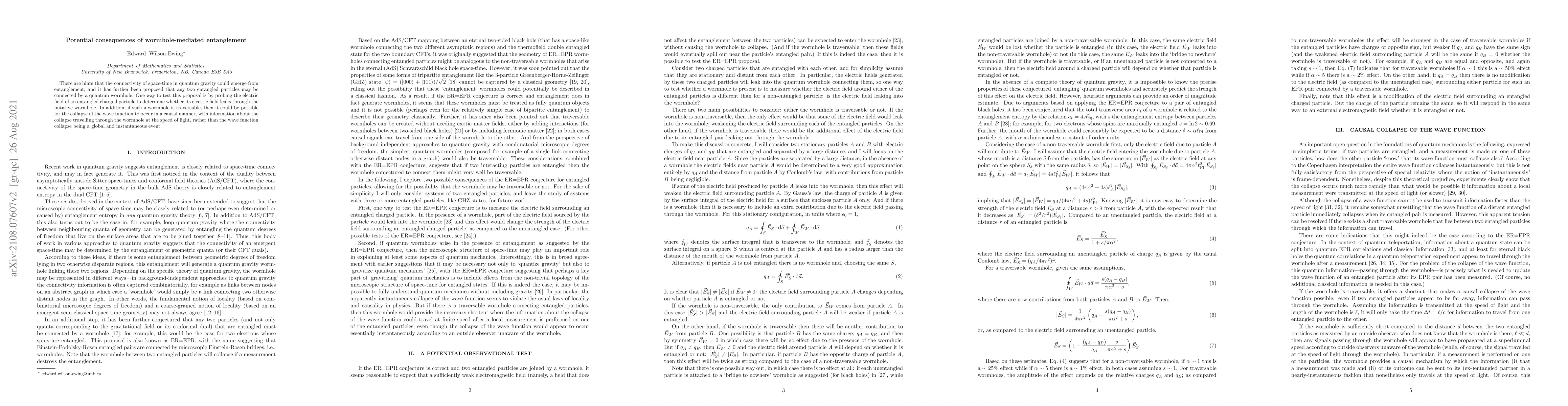 There are hints that the connectivity of space-time in quantum gravity could emerge from entanglement, and it has further been proposed that any two entangled particles may be connected by a quantum wormhole. One way to test this proposal is by probing the electric field of an entangled charged particle to determine whether its electric field leaks through the putative wormhole. In addition, if such a wormhole is traversable, then it could be possible for the collapse of the wave function to occur in a causal manner, with information about the collapse travelling through the wormhole at the speed of light, rather than the wave function collapse being a global and instantaneous event.