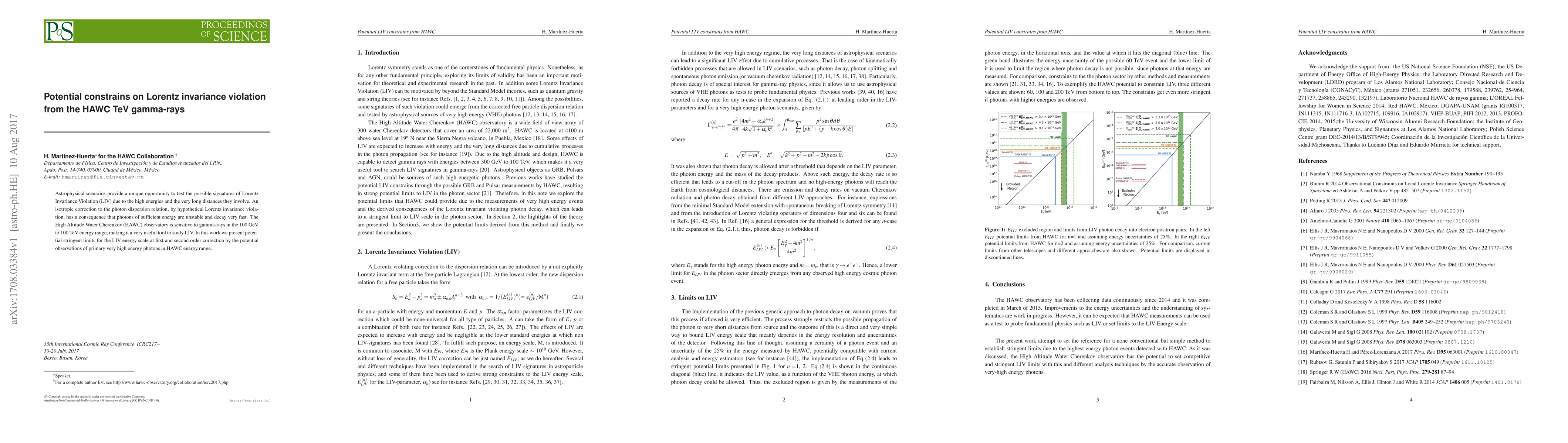 The HAWC observatory's observations of TeV gamma-rays provide stringent limits on Lorentz Invariance Violation (LIV) by testing the decay of high-energy photons, which would occur if LIV were present. The study sets potential constraints on the LIV energy scale for first and second-order corrections.