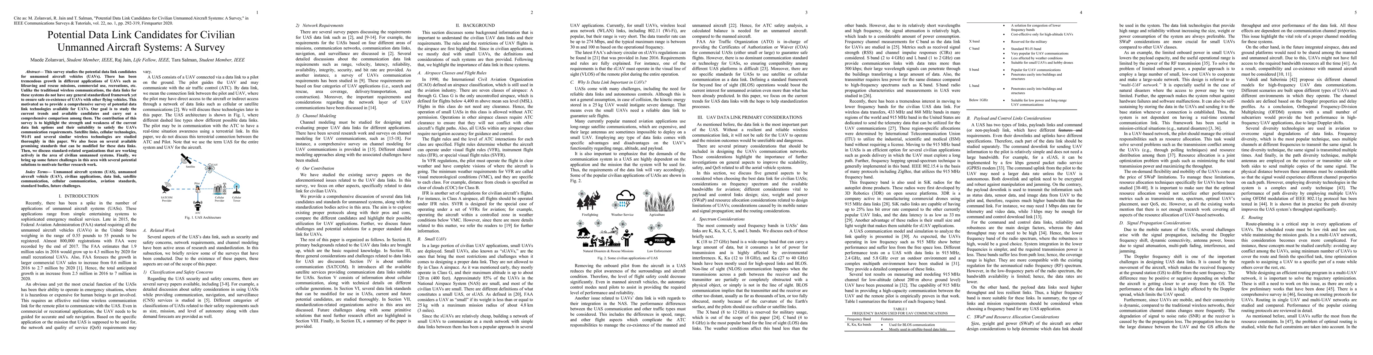 This survey investigates various data link candidates for civilian unmanned aircraft systems (UAVs), comparing technologies like satellite links, cellular, and Wi-Fi to identify their strengths and weaknesses for UAV communication needs. It also highlights ongoing standardization efforts and future challenges to guide further research.