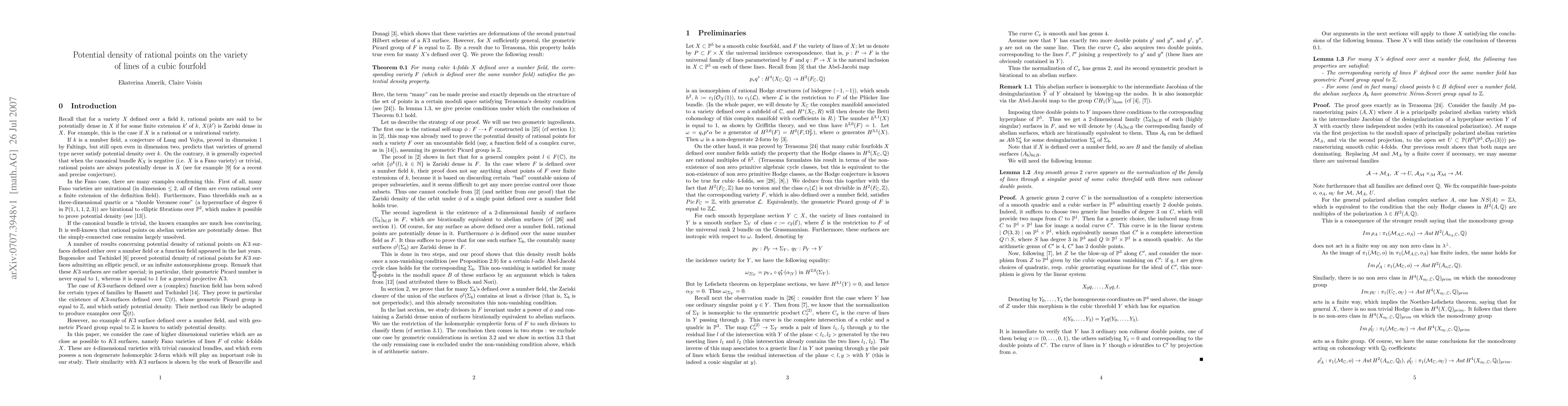 Summary: The paper proves the potential density of rational points on the variety of lines in a sufficiently general cubic fourfold defined over a number field, meeting a Terasoma-type condition. These varieties possess a trivial canonical bundle and a geometric Picard group isomorphic to $\mathbb{Z}$.