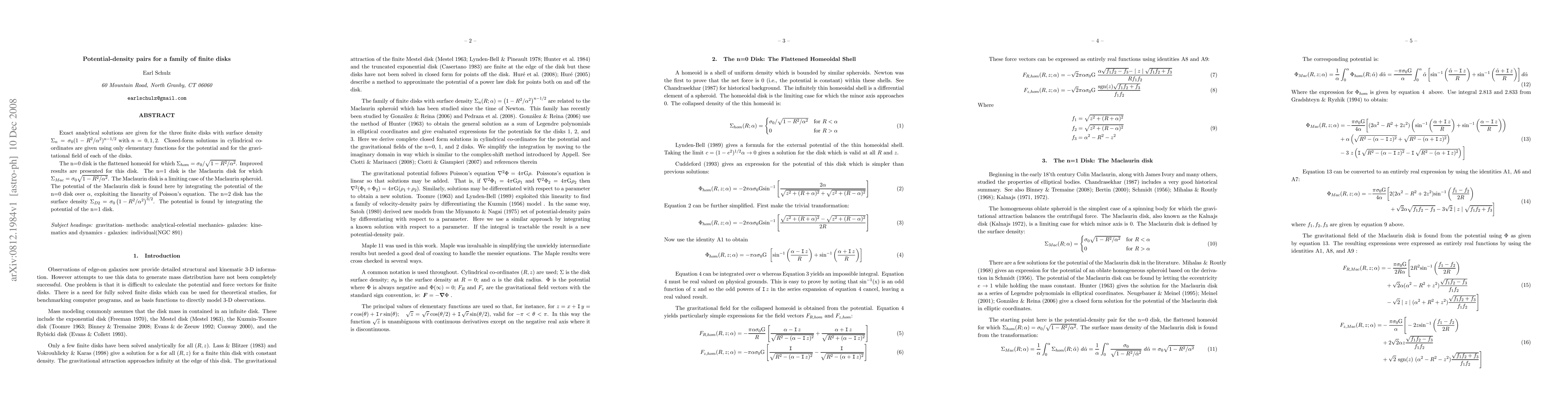 Exact analytical solutions are given for the three finite disks with surface density $\Sigma_n=\sigma_0 (1-R^2/\alpha^2)^{n-1/2} \textrm{with} n=0, 1, 2$. Closed-form solutions in cylindrical co-ordinates are given using only elementary functions for the potential and for the gravitational field of each of the disks. The n=0 disk is the flattened homeoid for which $\Sigma_{hom} = \sigma_0/\sqrt{1-R^2/\alpha^2}$. Improved results are presented for this disk. The n=1 disk is the Maclaurin disk for which $\Sigma_{Mac} = \sigma_0 \sqrt{1-R^2/\alpha^2}$. The Maclaurin disk is a limiting case of the Maclaurin spheroid. The potential of the Maclaurin disk is found here by integrating the potential of the n=0 disk over $\alpha$, exploiting the linearity of Poisson's equation. The n=2 disk has the surface density $\Sigma_{D2}=\sigma_0 (1-R^2/\alpha^2)^{3/2}$. The potential is found by integrating the potential of the n=1 disk.