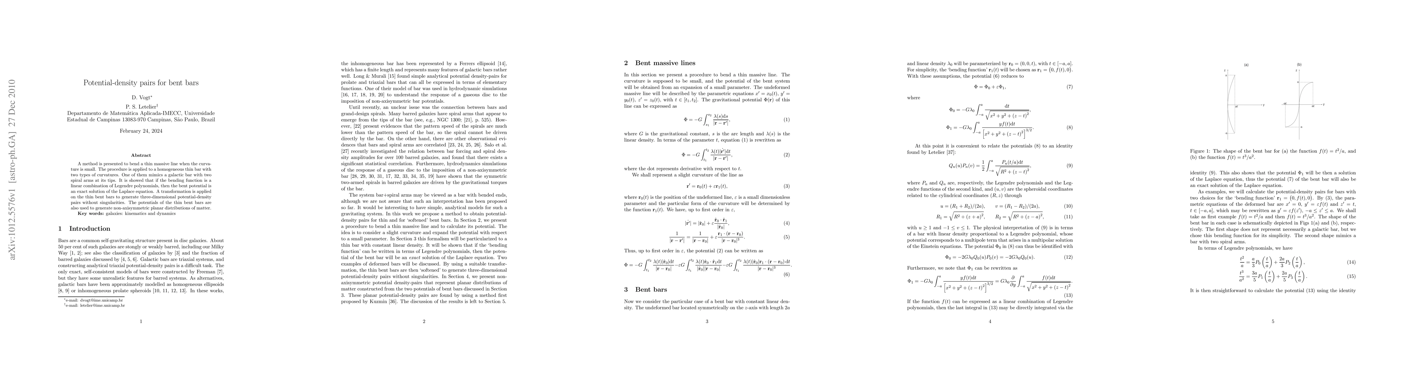 A method is presented to bend a thin massive line when the curvature is small. The procedure is applied to a homogeneous thin bar with two types of curvatures. One of them mimics a galactic bar with two spiral arms at its tips. It is showed that if the bending function is a linear combination of Legendre polynomials, then the bent potential is an exact solution of the Laplace equation. A transformation is applied on the thin bent bars to generate three-dimensional potential-density pairs without singularities. The potentials of the thin bent bars are also used to generate non-axisymmetric planar distributions of matter.
