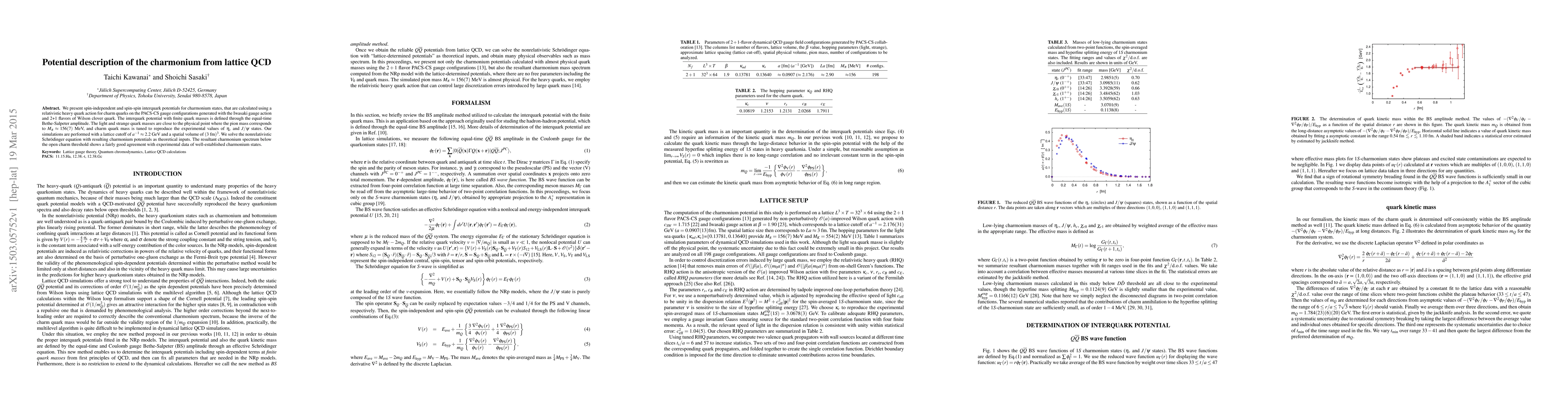 We present spin-independent and spin-spin interquark potentials for charmonium states, that are calculated using a relativistic heavy quark action for charm quarks on the PACS-CS gauge configurations generated with the Iwasaki gauge action and 2+1 flavors of Wilson clover quark. The interquark potential with finite quark masses is defined through the equal-time Bethe-Salpeter amplitude. The light and strange quark masses are close to the physical point where the pion mass corresponds to $M_\pi \approx 156(7)$ MeV, and charm quark mass is tuned to reproduce the experimental values of $\eta_c$ and $J/\psi$ states. Our simulations are performed with a lattice cutoff of $a^{-1}\approx 2.2$ GeV and a spatial volume of $(3 {\rm fm})^3$. We solve the nonrelativistic Schr\"odinger equation with resulting charmonium potentials as theoretical inputs. The resultant charmonium spectrum below the open charm threshold shows a fairly good agreement with experimental data of well-established charmonium states.